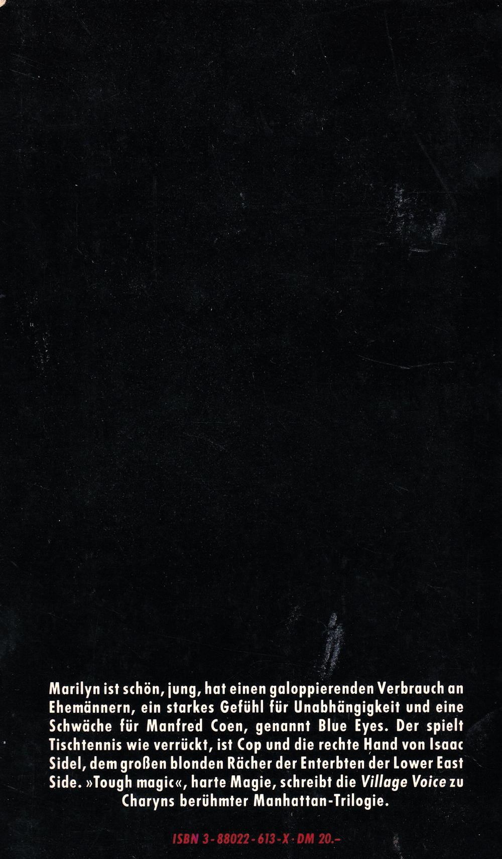 Marilyn ist schön, jung, hat einen galoppierenden Verbrauch Ehemännern, ein starkes Gefühl für Unabhängigkeit und eine Schwäche für Manfred Coen, genannt Blue Eyes. Der spielt Tischtennis wie verrückt, ist Cop und die rechte Hand von Isaac Sidel, dem grossen blonden Rächer der Enterbten der Lower East Side. »Tough magic«, harte Magie, schreibt die Village Voice zu Charyns berühmter Manhattan-Trilogie.