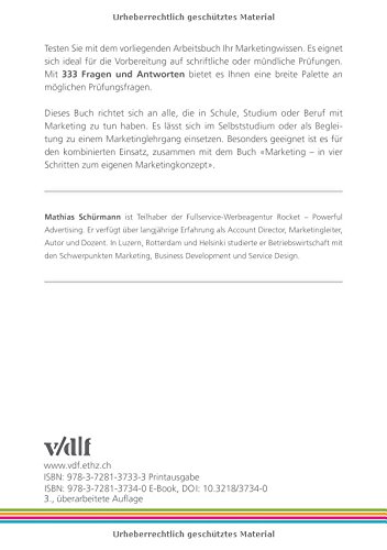 Testen Sie mit dem vorliegenden Arbeitsbuch Ihr Marketingwissen. Es eignet sich ideal für die Vorbereitung auf schriftliche oder mündliche Prüfungen. Mit 333 Fragen und Antworten bietet es Ihnen eine breite Palette an möglichen Prüfungsfragen. Dieses Buch richtet sich an alle, die in Schule, Studium oder Beruf mit Marketing zu tun haben. Es lässt sich im Selbststudium oder als Begleitung zu einem Marketinglehrgang einsetzen. Besonders geeignet ist es für den kombinierten Einsatz, zusammen mit dem Buch Marketing - in vier Schritten zum eigenen Marketingkonzept.