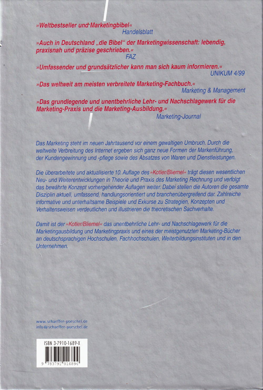 Das Marketing steht im neuen Jahrtausend vor einem gewaltigen Umbruch. Durch die weltweite Verbreitung des Internet ergeben sich ganz neue Formen der Markenführung, der Kundengewinnung und -pflege sowie des Absatzes von Waren und Dienstleistungen. DieNeuauflage von Philip Kotlers erfolgreichem Lehrbuch "Marketing-Management", von Prof. Friedhelm Bliemel kongenial an deutsche bzw. europäische Verhältnisse angepasst, trägt den wesentlichen Neu- und Weiterentwicklungen in Theorie und Praxis des Marketing Rechnung. Es gelingt den Autoren auch mit der 10. Auflage, die gesamte Disziplin aktuell, umfassend, handlungsorientiert und branchenübergreifend darzustellen, wozu viele informative und unterhaltsame Beispiele und Fallstudien beitragen. Nicht zuletzt deshalb wird auch der neue "Kotler/Bliemel" wieder eines der meistgenutzten Marketing-Lehrbücher an deutschsprachigen Hochschulen, Fachhochschulen und Weiterbildungsinstituten sein.