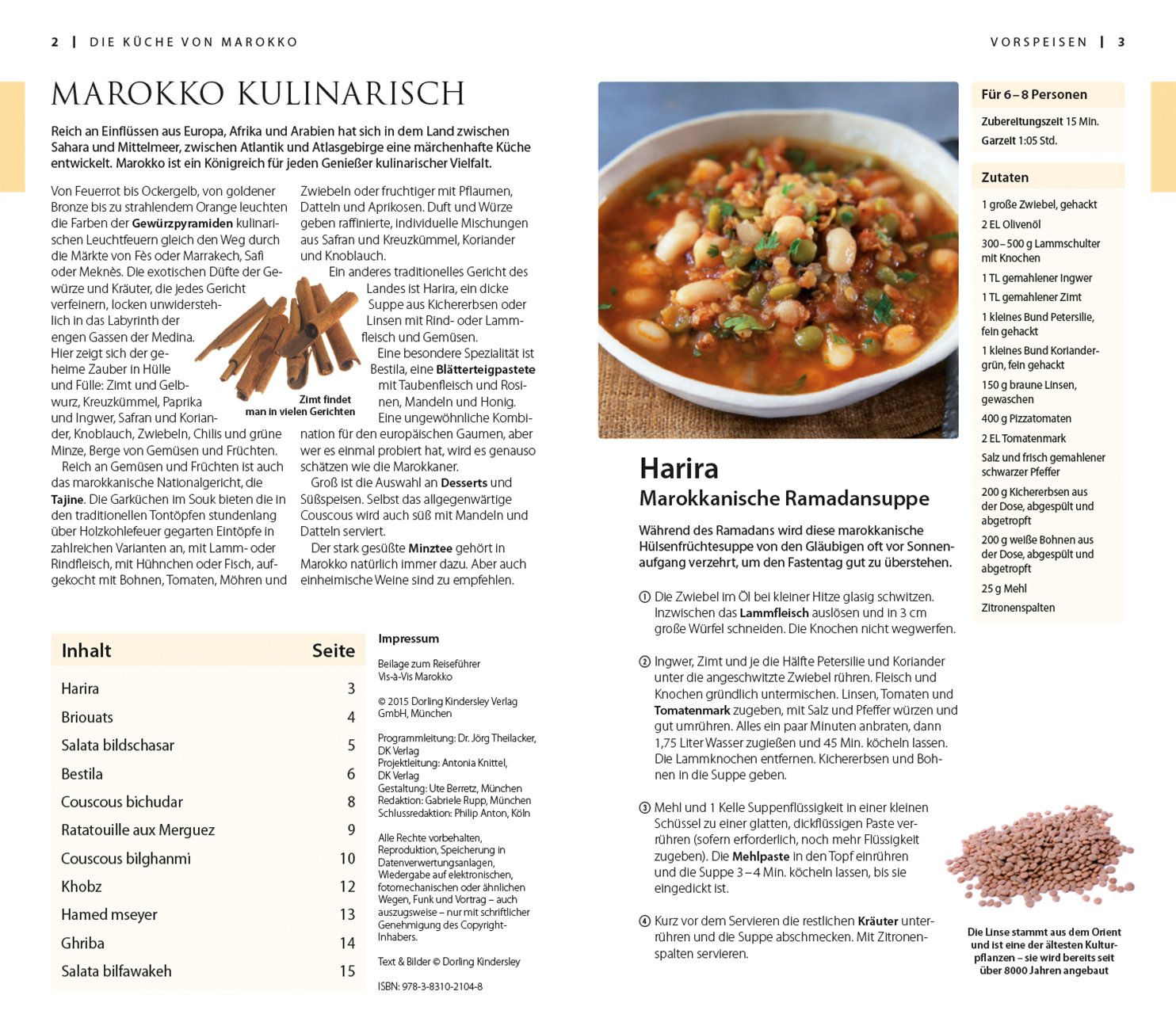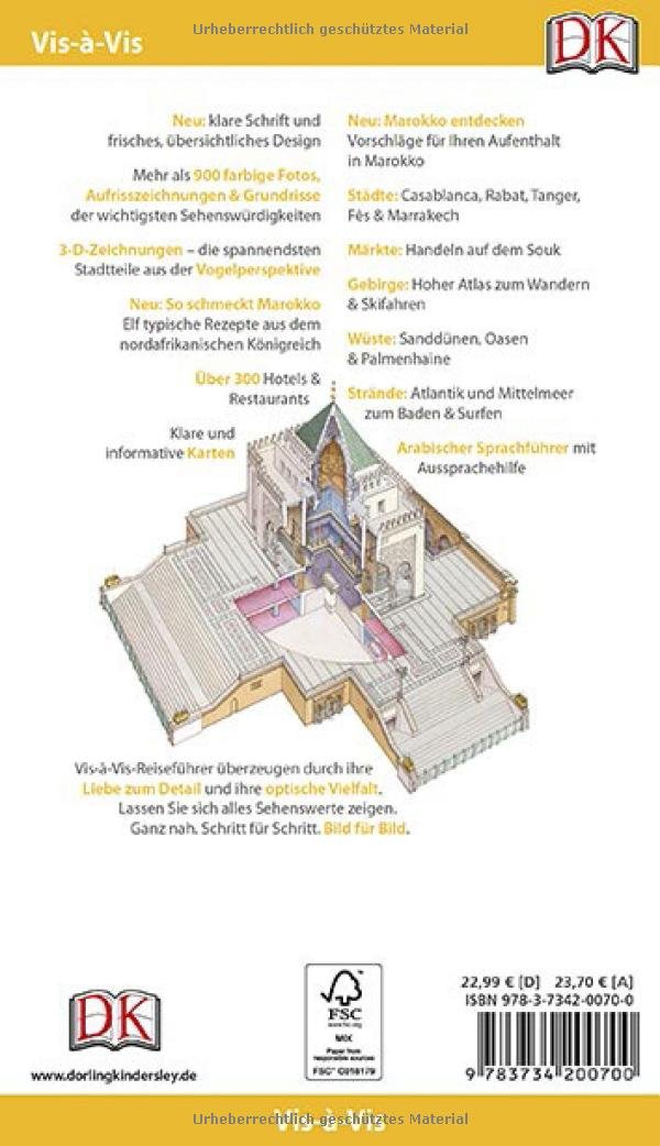 Im Vis-à-Vis Marokko finden Sie für jedes Vorhaben alle Informationen, die Sie benötigen: vom Hotel mit traditionellem Ambiente in Rabat über das marokkanische Restaurant in Marrakech bis zu den schönsten Keramiken. Die Städte Casablanca, Rabat, Tanger, Fès und Marrakech werden ausführlich vorgestellt, ebenso die einzelnen Regionen Marokkos. Zahlreiche Features zur Geschichte und zu den marokkanischen Traditionen veranschaulichen die Besonderheiten des Landes. Ausserdem gibt es eine kleine Anleitung, wie man auf den traditionellen Souks, den Wochenmärkten, feilscht.