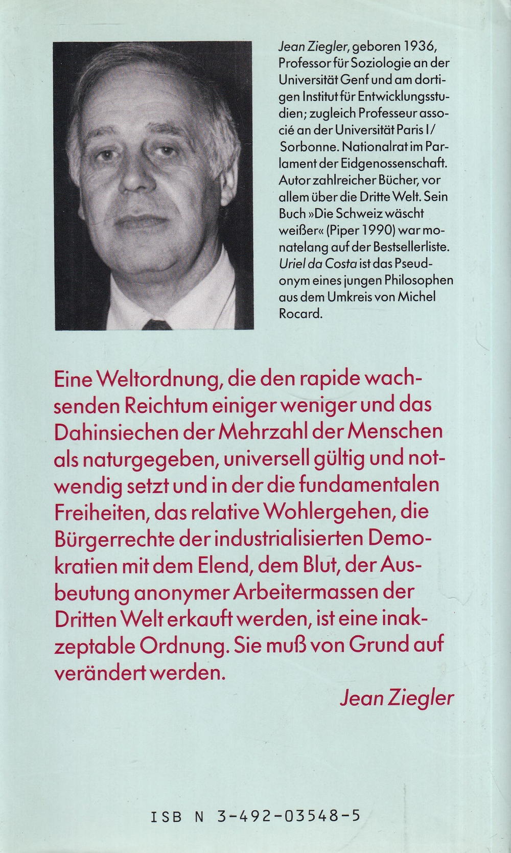 Jean Ziegler, geboren 1936, Professor für Soziologie an der Universität Genf und am dortigen Institut für Entwicklungsstudien; zugleich Professeur associé an der Universität Paris I/ Sorbonne. Nationalrat im Parlament der Eidgenossenschaft.