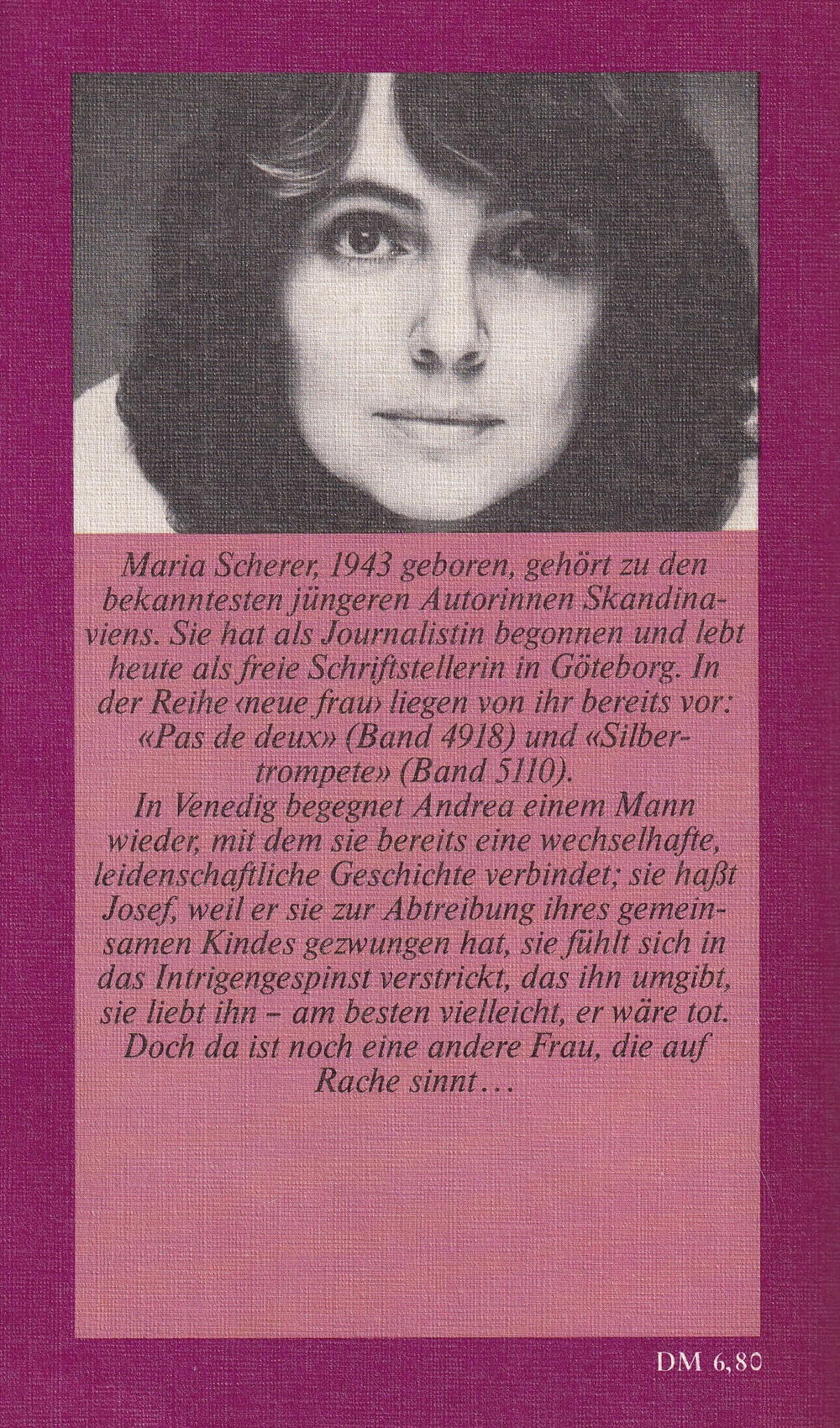 Maria Scherer, 1943 geboren, gehört zu den bekanntesten jüngeren Autorinnen Skandinaviens. Sie hat als Journalistin begonnen und lebt heute als freie Schriftstellerin in Göteborg. In der Reihe «neue frau) liegen von ihr bereits vor: «Pas de deux» (Band 4918) und «Silbertrompete» (Band 5110).