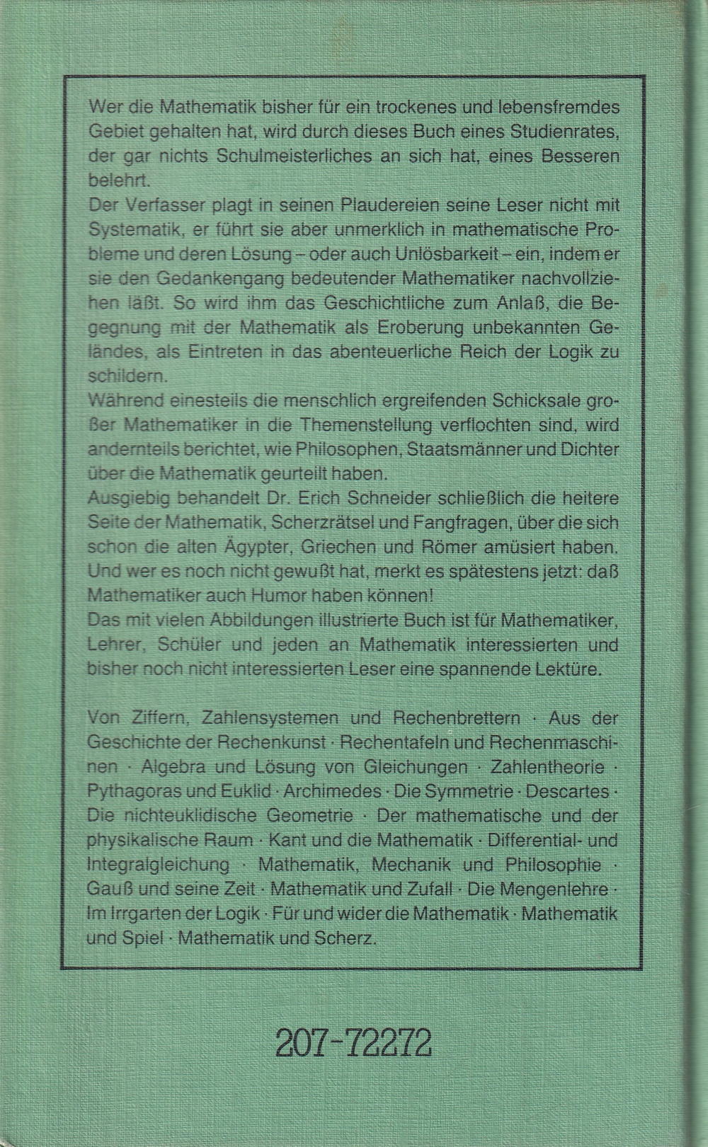Ausgiebig behandelt Dr. Erich Schneider schliesslich die heitere Seite der Mathematik, Scherzrätsel und Fangfragen, über die sich schon die alten Ägypter, Griechen und Römer amüsiert haben.