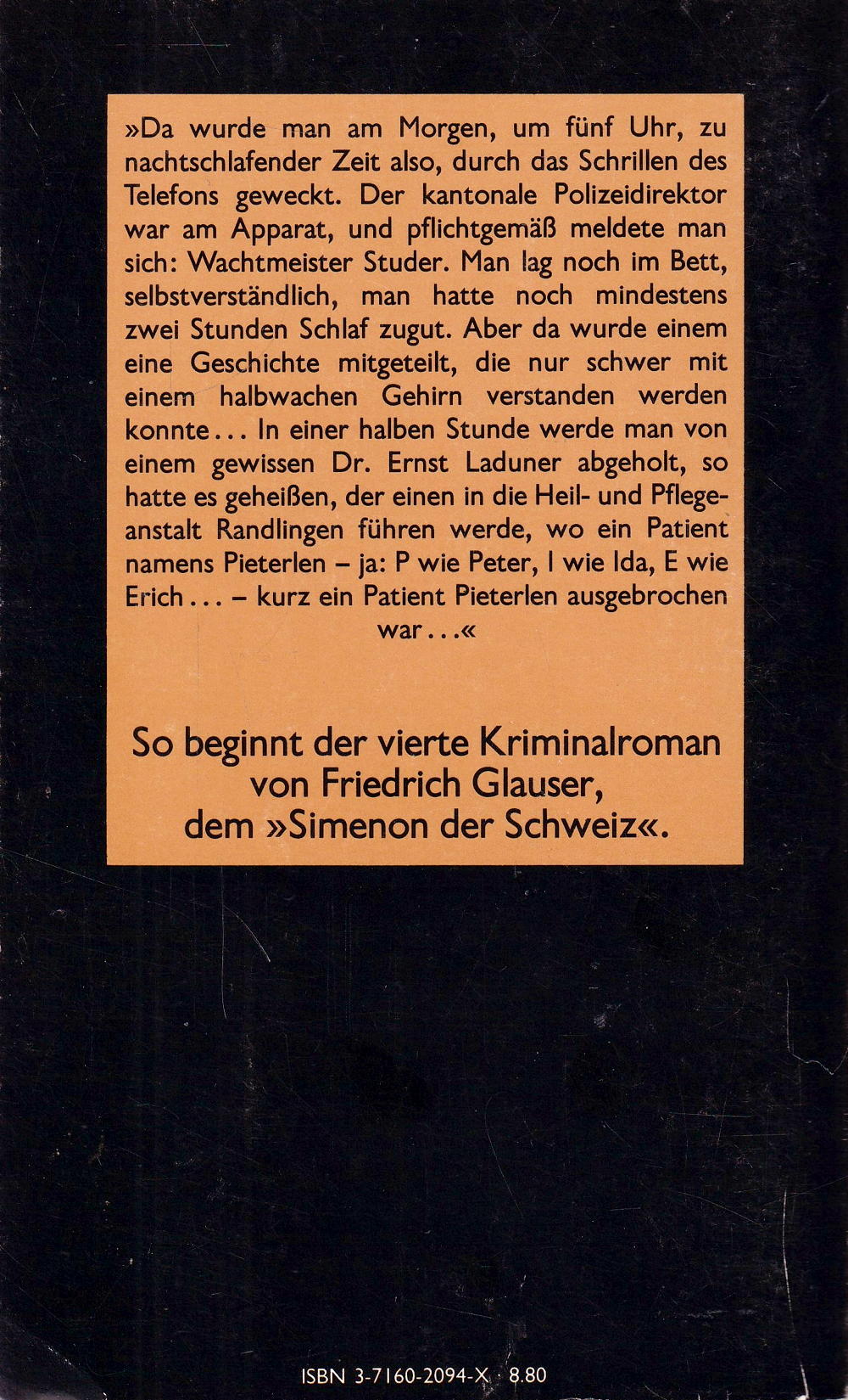 »Da wurde man am Morgen, um fünf Uhr, zu nachtschlafender Zeit also, durch das Schrillen des Telefons geweckt. Der kantonale Polizeidirektor war am Apparat, und pflichtgemäss meldete man sich: Wachtmeister Studer. Man lag noch im Bett, selbstverständlich, man hatte noch mindestens zwei Stunden Schlaf zugut. Aber da wurde einem eine Geschichte mitgeteilt, die nur schwer mit einem halbwachen Gehirn verstanden werden konnte... In einer halben Stunde werde man von einem gewissen Dr. Ernst Laduner abgeholt, so hatte es geheissen, der einen in die Heil- und Pflegeanstalt Randlingen führen werde, wo ein Patient namens Pieterlen - ja: P wie Peter, I wie Ida, E wie Erich... - kurz ein Patient Pieterlen ausgebrochen war... «