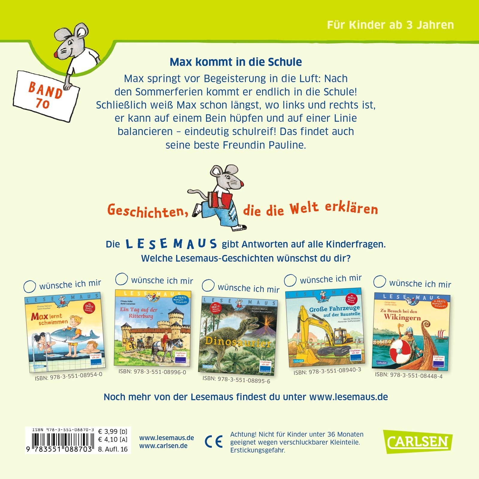 Max springt vor Begeisterung in die Luft: Nach den Sommerferien kommt er endlich in die Schule! Schliesslich weiss Max schon längst, wo links und rechts ist, er kann auf einem Bein hüpfen und auf einer Linie balancieren - eindeutig schulreif! Das findet auch seine beste Freundin Pauline.