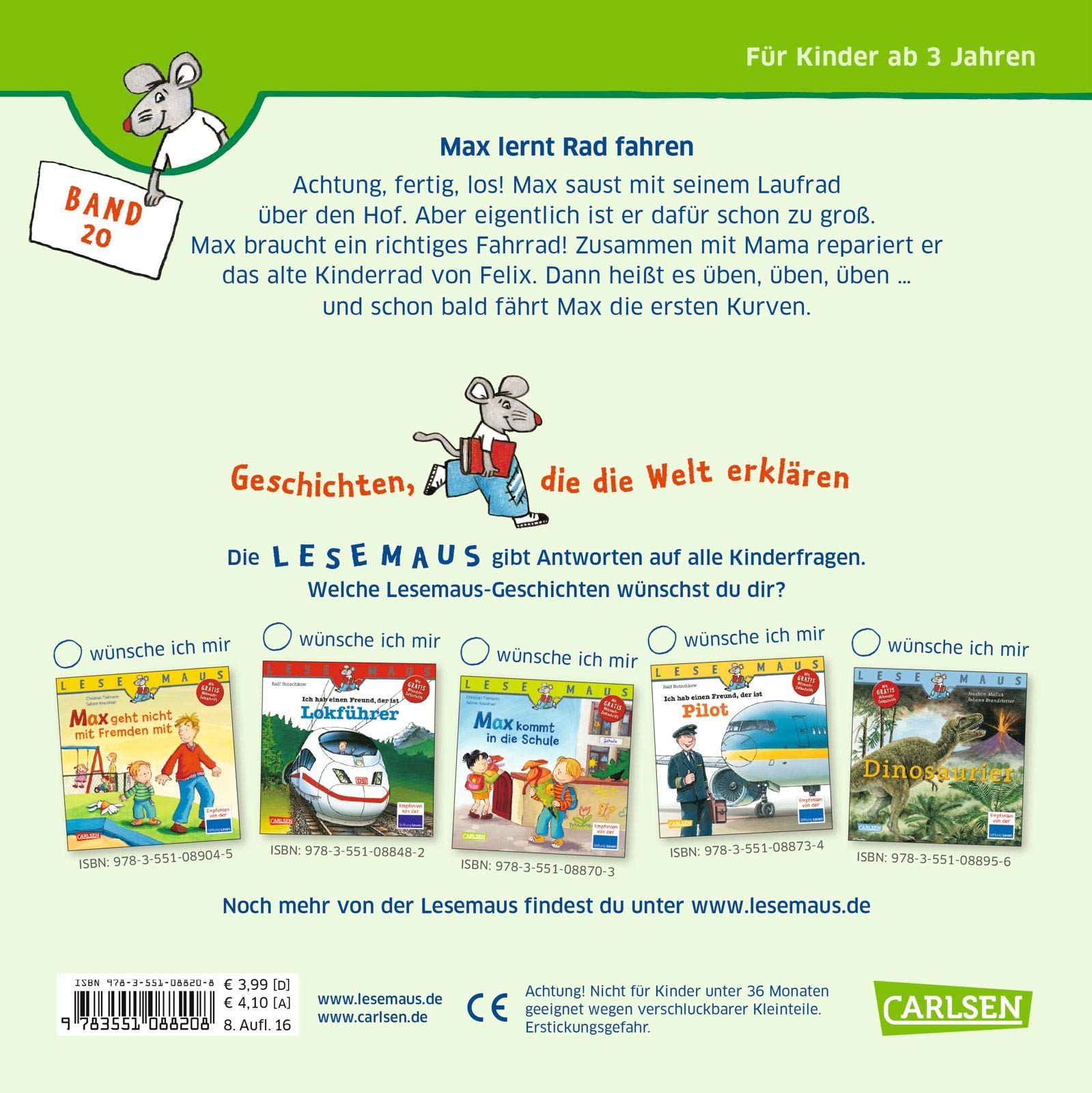 Achtung, fertig, los! Max saust mit seinem Laufrad über den Hof. Aber eigentlich ist er dafür schon zu gross. Max braucht ein richtiges Fahrrad! Zusammen mit Mama repariert er das alte Kinderrad von Felix. Dann heisst es üben, üben, üben ... und schon bald fährt Max die ersten Kurven.
