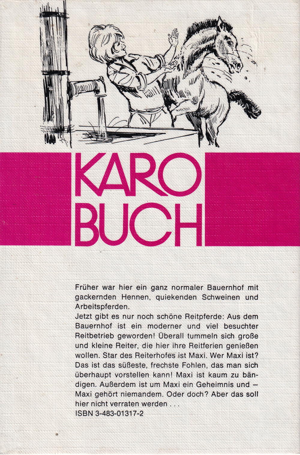 Früher war hier ein ganz normaler Bauernhof mit gackernden Hennen, quiekenden Schweinen und Arbeitspferden. Jetzt gibt es nur noch schöne Reitpferde: Aus dem Bauernhof ist ein moderner und viel besuchter Reitbetrieb geworden! Überall tummeln sich grosse und kleine Reiter, die hier ihre Reitferien geniessen wollen. Star des Reiterhofes ist Maxi. Wer Maxi ist? Das ist das süsseste, frechste Fohlen, das man sich überhaupt vorstellen kann! Maxi ist kaum zu bändigen. Ausserdem ist um Maxi ein Geheimnis und -Maxi gehört niemandem. Oder doch? Aber das soll hier nicht verraten werden.
