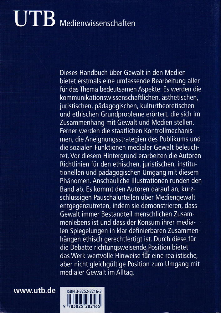 Ferner werden die staatlichen Kontrollmechanismen, die Aneignungsstrategien des Publikums und die sozialen Funktionen medialer Gewalt beleuchtet. Vor diesem Hintergrund erarbeiten die Autoren Richtlinien für den ethischen, juristischen, institutionellen und pädagogischen Umgang mit diesem Phänomen. Anschauliche Illustrationen runden den Band ab. Es kommt den Autoren darauf an, kurzschlüssigen Pauschalurteilen über Mediengewalt entgegenzutreten, indem sie demonstrieren, dass Gewalt immer Bestandteil menschlichen Zusammenlebens ist und dass der Konsum ihrer medialen Spiegelungen in klar definierbaren Zusammenhängen ethisch gerechtfertigt ist. Durch diese für die Debatte richtungsweisende Position bietet das Werk wertvolle Hinweise für eine realistische, aber nicht gleichgültige Position zum Umgang mit medialer Gewalt im Alltag.