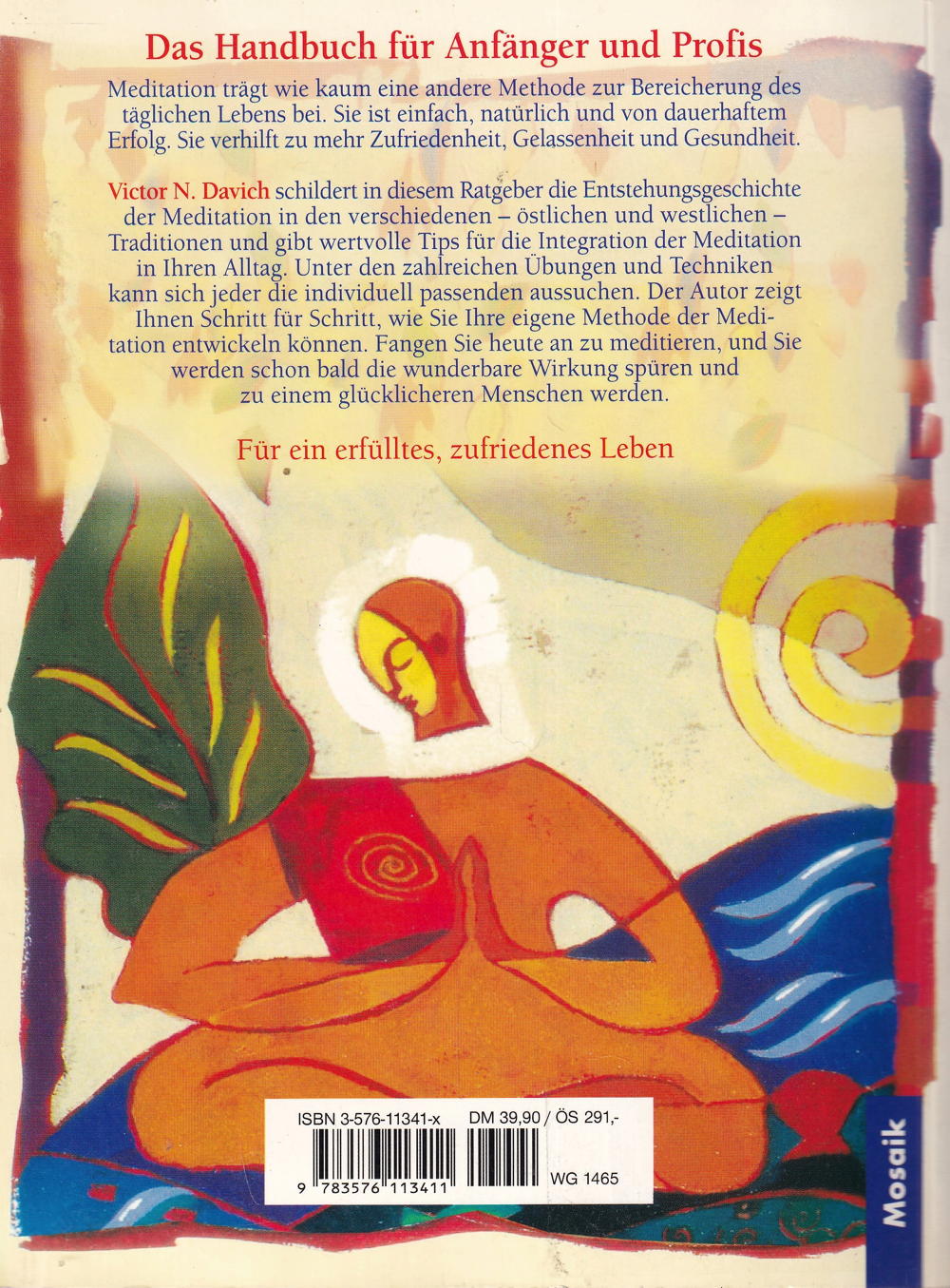 Victor N. Davich schildert in diesem Ratgeber die Entstehungsgeschichte der Meditation in den verschiedenen – östlichen und westlichen -Traditionen und gibt wertvolle Tips für die Integration der Meditation in Ihren Alltag. Unter den zahlreichen Übungen und Techniken kann sich jeder die individuell passenden aussuchen. Der Autor zeigt Ihnen Schritt für Schritt, wie Sie Ihre eigene Methode der Meditation entwickeln können. Fangen Sie heute an zu meditieren, und Sie werden schon bald die wunderbare Wirkung spüren und zu einem glücklicheren Menschen werden.