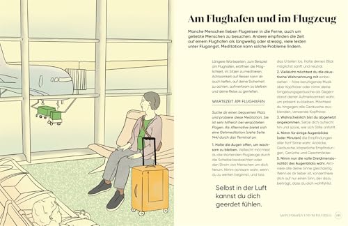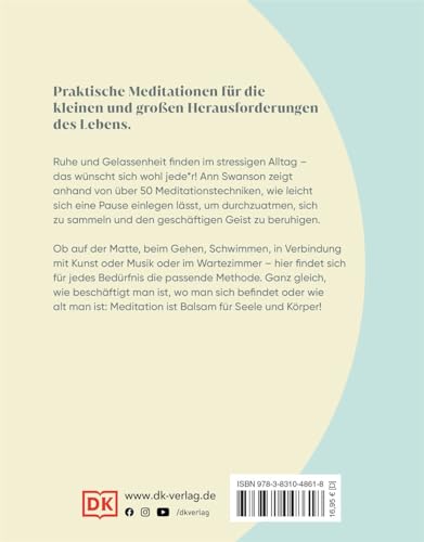 In einem von Stress und Hektik geprägten Alltag wird es zunehmend wichtiger, Momente der inneren Ruhe und Achtsamkeit zu finden. Es ist wissenschaftlich erwiesen, dass regelmässiges Meditieren eine gesundheitsfördernde Wirkung hat. Dieses Buch zeigt, dass es sich wirklich in jedem Alltag umsetzen lässt. Die Expertin Ann Swanson stellt in diesem kompakten Ratgeber 50 praktikable Meditationstechniken vor, die sich ganz leicht in Ihre tägliche Routine einbauen lassen. Ob auf der Yogamatte, beim Laufen, Schwimmen oder in Verbindung mit Kunst oder Musik: Finden Sie heraus, welche Meditations-Methode für Sie am besten funktioniert! Neben Übungen zur täglichen Entspannung unterstützt Sie das Meditationsbuch zusätzlich in bestimmten Situationen und Stress-Momenten, wie z. B. vor einem Flug, vor einer Präsentation oder beim Einschlafen. Balsam für Seele und Körper: Praktische Meditation für die kleinen und grossen Herausforderungen des Lebens!