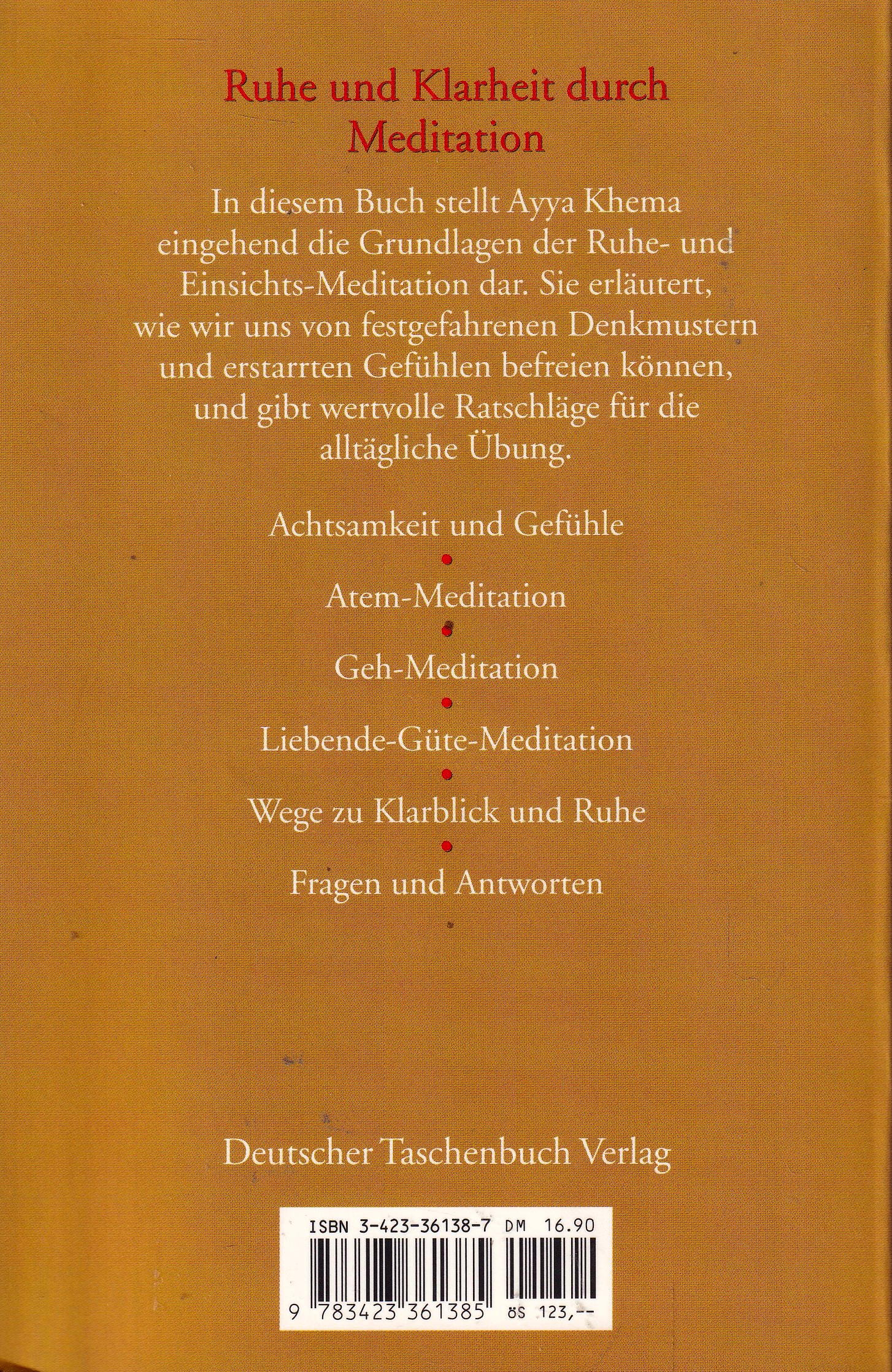 Ayya Khema wurde als Kind jüdischer Eltern 1923 in Berlin geboren. Mit 15 Jahren musste sie vor den Nazis aus Deutschland fliehen. Später heiratete sie, bekam zwei Kinder, lebte in den USA und in Australien. Auf ihren Reisen durch Asien kam sie mit der Lehre des Buddha in Berührung und liess sich schliesslich mit 56 Jahren in Sri Lanka zur Nonne ordinieren. Auf ihre Initiative wurde 1989 das Buddha-Haus und ein Jahr später der Jhana Verlag gegründet. 1997 entstand das Waldkloster Metta Vihara im Allgäu. Ayya Khema hatte die Fähigkeit, aus der Tiefe ihrer Erfahrung heraus, die buddhistische Meditation und die Lehre des Buddha in klare und einfache Worte zu fassen und so die Herzen der Menschen im Innersten zu berühren. Sie war eine der grössten Mystikerinnen des letzten Jahrhunderts und starb im November 1997 im Buddha-Haus.