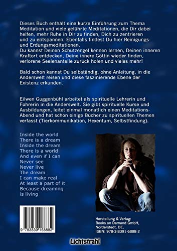 Dieses Buch enthält eine kurze Einführung zum Thema Meditation und viele geführte Meditationen, die Dir dabei helfen, mehr Ruhe in Dir zu finden, Dich zu zentrieren und zu entspannen. Ebenfalls findest Du hier Reinigungs- und Erdungsmeditationen.Du kannst Deinen Schutzengel kennen lernen, Deinen inneren Kraftort entdecken, Deine innere Göttin wieder finden, verlorene Seelenanteile zurück holen und vieles mehr! Bald schon kannst Du selbständig, ohne Anleitung, in die Anderswelt reisen und diese faszinierende Ebene der Existenz erkunden.