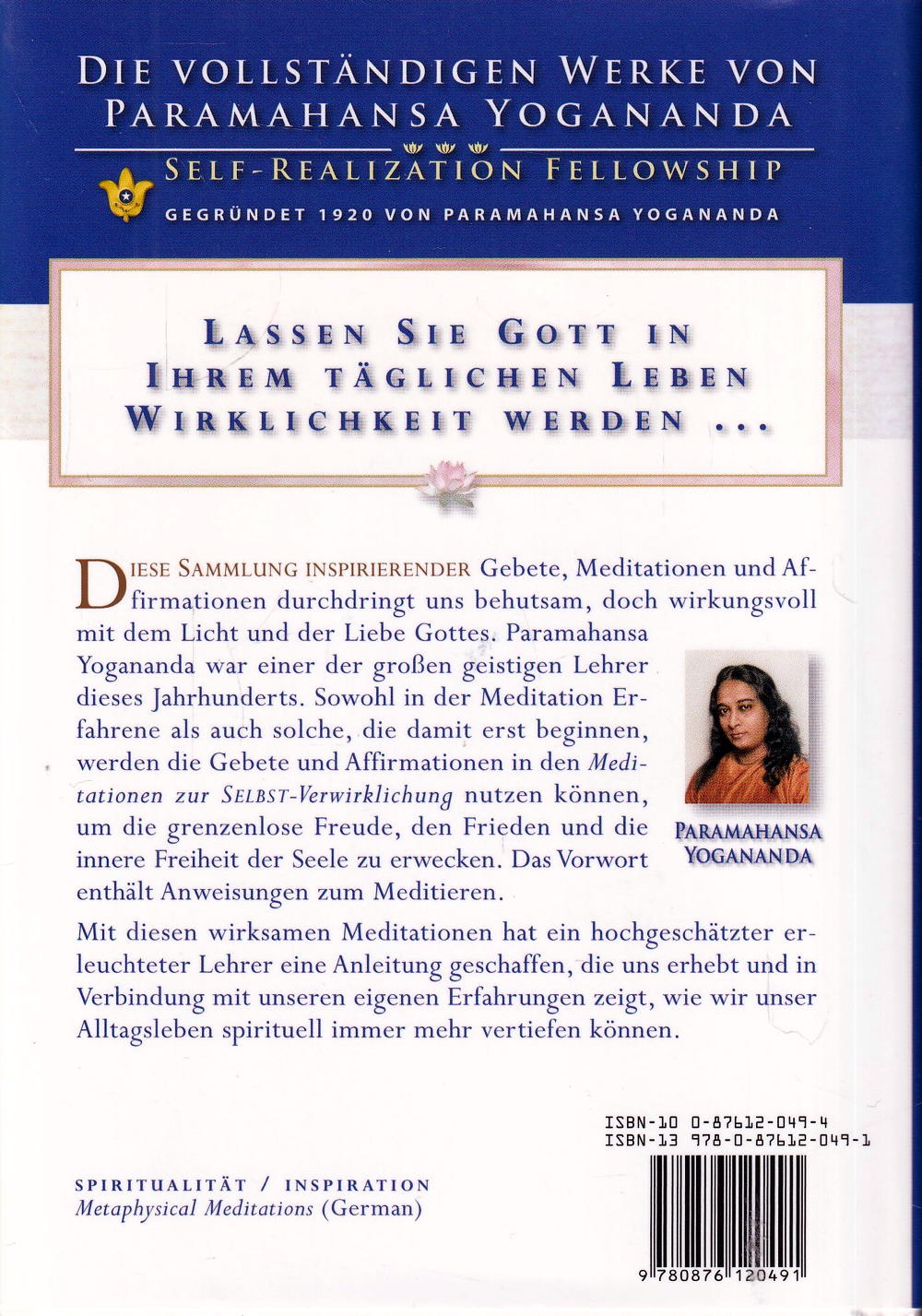 DIESE SAMMLUNG INSPIRIERENDER Gebete, Meditationen und Bestätigungen durchdringt uns behutsam, doch wirkungsvoll mit dem Licht und der Liebe Gottes. Paramahansa Yogananda war einer der grossen geistigen Lehrer dieses Jahrhunderts. Sowohl in der Meditation Erfahrene als auch solche, die damit erst beginnen, werden die Gebete und Betätigungen in den Meditationen zur Selbst-Verwirklichung nutzen können, um die grenzenlose Freude, den Frieden und die innere Freiheit der Seele zu erwecken. Das Vorwort enthält Anweisungen darüber, wie man meditieren soll.