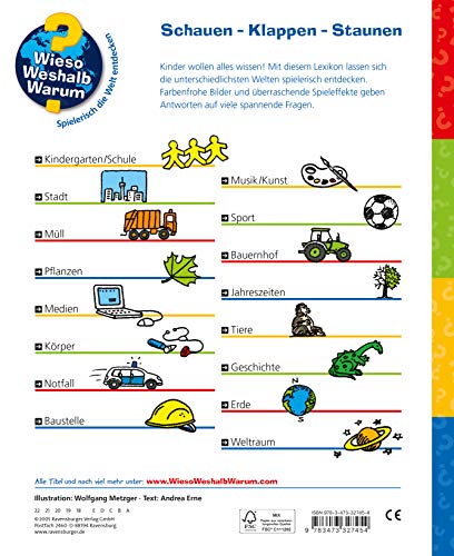 Wie heissen die Körperteile? Wer hilft beim Bau eines Hauses? Und woher kommt die Milch? Ob Kinder nun der Kindergarten, die Baustelle, der Körper, der Bauernhof oder das Weltall interessiert: Dieses Lexikon beantwortet viele ihrer Fragen. Liebevolle Illustrationen und überraschende Klappen laden die Kinder ein, in 18 unterschiedliche Themen einzutauchen. Ein Register mit bunten Symbolen hilft bei der Orientierung. So können schon Kinder ab 4 Jahren Wissen selbstständig nachschlagen.
