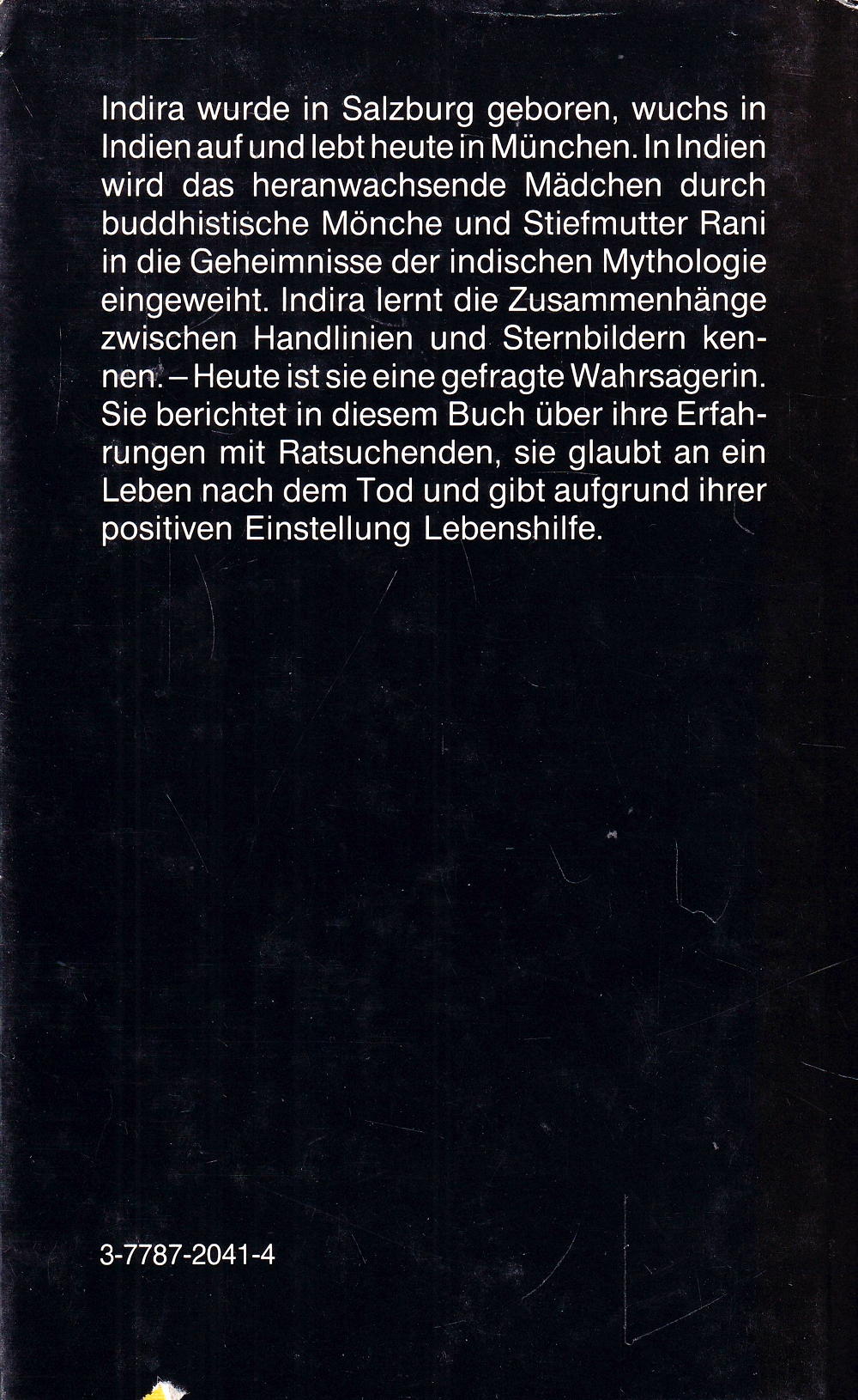 Indira wurde in Salzburg gęboren, wuchs in Indien auf und lebt heute in München. In Indien wird das heranwachsende Mädchen durch buddhistische Mönche und Stiefmutter Rani in die Geheimnisse der indischen Mythologie eingeweiht. Indira lernt die Zusammenhänge zwischen Handlinien und Sternbildern kennen. - Heute ist sie eine gefragte Wahrsagerin.