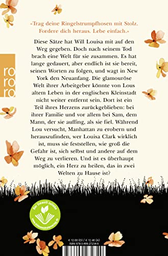 Diese Sätze hat Will Louisa mit auf den Weg gegeben. Doch nach seinem Tod brach eine Welt für sie zusammen. Es hat lange gedauert, aber endlich ist sie bereit, seinen Worten zu folgen und wagt in New York den Neuanfang. Die glamouröse Welt ihrer Arbeitgeber könnte von Lous altem Leben in der englischen Kleinstadt nicht weiter entfernt sein. Dort ist ein Teil ihres Herzens zurückgeblieben: bei ihrer liebenswert chaotischen Familie und vor allem bei Sam, dem Mann, der sie auffing, als sie fiel. Während Lou versucht, New York zu erobern und herauszufinden, wer Louisa Clark wirklich ist, muss sie feststellen, wie gross die Gefahr ist, sich selbst und andere auf dem Weg zu verlieren. Und am Ende muss sie sich die Frage stellen: Ist es möglich, ein Herz zu heilen, das in zwei Welten zuhause ist?