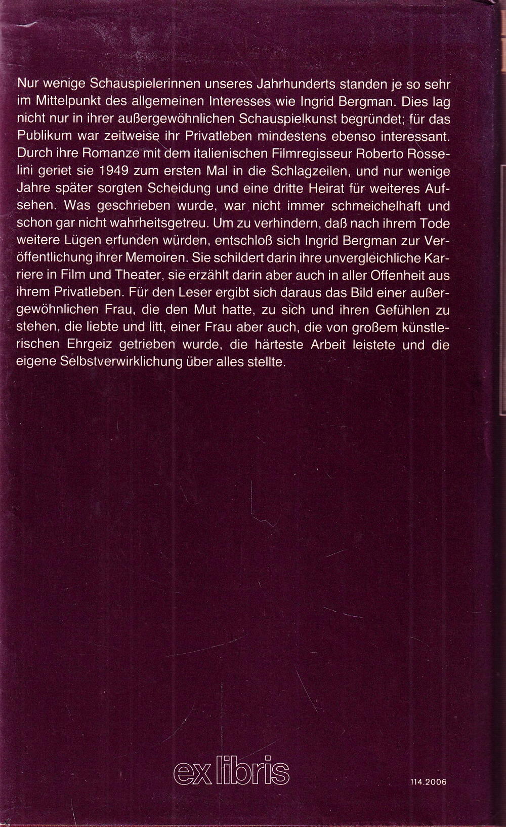 Durch ihre Romanze mit dem italienischen Filmregisseur Roberto Rosselini geriet sie 1949 zum ersten Mal in die Schlagzeilen, und nur wenige Jahre später sorgten Scheidung und eine dritte Heirat für weiteres Aufsehen. Was geschrieben wurde, war nicht immer schmeichelhaft und nicht wahrheitsgetreu. Um zu verhindern, dass nach ihrem Tode weitere Lügen erfunden würden, entschloss sich Ingrid Bergman zur Veröffentlichung ihrer Memoiren. Sie schildert darin ihre unvergleichliche Karriere in Film und Theater, sie erzählt darin aber auch in aller Offenheit aus schon gar ihrem Privatleben. Für den Leser ergibt sich daraus das Bild einer aussergewöhnlichen Frau, die den Mut hatte, zu sich und ihren Gefühlen zu stehen, die liebte und litt, einer Frau aber auch, die von grossem künstlerischen Ehrgeiz getrieben wurde, die härteste Arbeit leistete und die eigene Selbstverwirklichung über alles stellte.