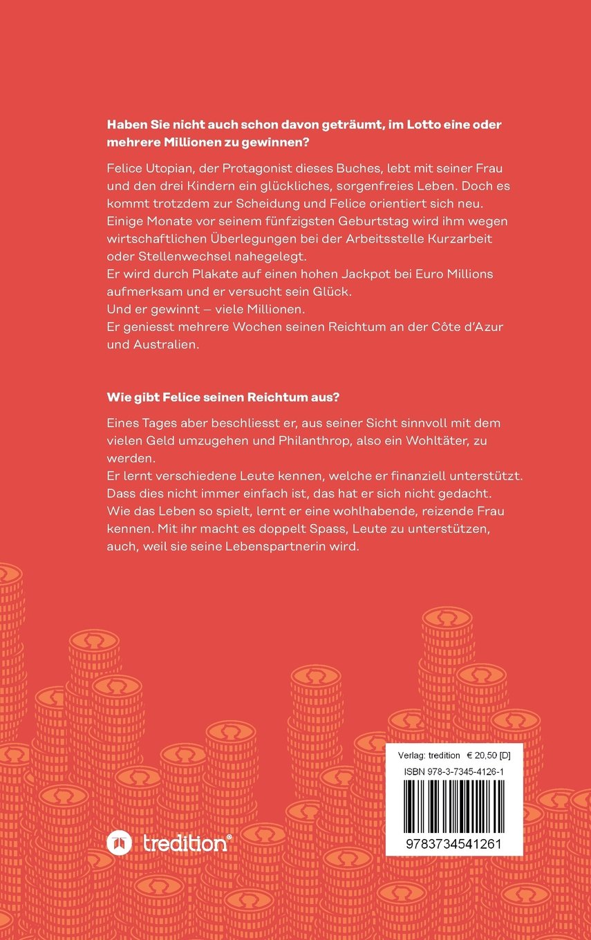 Felice Utopian, der Protagonist dieses Buches lebt mit seiner Frau und den drei Kindern ein glückliches, sorgenfreies Leben. Doch es kommt trotzdem zur Scheidung und Felice orientiert sich neu. Einige Monate vor seinem fünfzigsten Geburtstag wird ihm wegen wirtschaftlichen Überlegungen bei der Arbeitsstelle Kurzarbeit oder Stellenwechsel nahe gelegt. Er wird durch Plakate auf einen hohen Jackpot bei Euro Millions aufmerksam und er versucht sein Gluck. Und er gewinnt - viele Millionen. Er geniesst mehrere Wochen seinen Reichtum an der Cote d'Azur und Australien. Eines Tages aber beschliesst er, aus seiner Sicht sinnvoll mit dem vielen Geld umzugehen und Philanthrop, also ein Wohltäter zu werden. Er lernt verschiedene Leute kennen, welche er finanziell unterstützt. Dass dies nicht immer einfach ist, das hat er sich nicht gedacht. Wie das Leben so spielt, lernt er eine reizende, wohlhabende Frau kennen. Mit ihr macht es doppelt Spass, Leute zu unterstützen, auch, weil sie seine Lebenspartnerin wird."