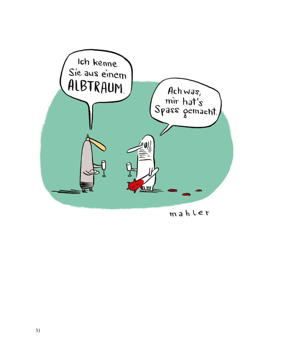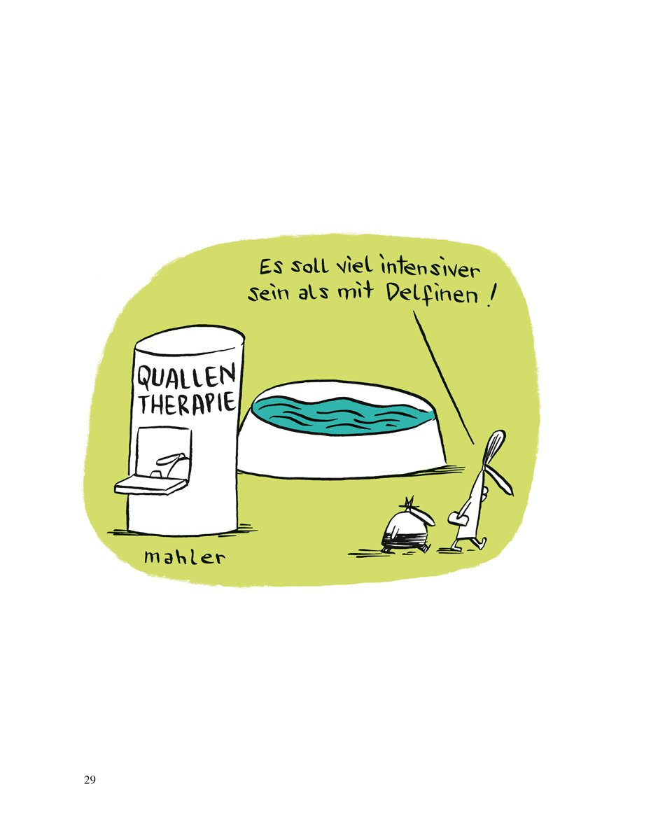 Gegen Zwangsvorstellungen, Irrsinn, Albträume, Bindungsangst kann eventuell Chaos-, Licht-, Glücks- und Aromatherapie helfen. Und wenn das alles versagt? Dann gibt es nur noch eins: Cartoons von Nicolas Mahler! Die sind garantiert billiger und einfacher in der Anwendung. Ein Versuch lohnt sich.