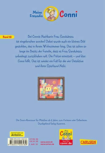 Viel gestohlen wurde nicht - aber unter anderem auch ein kleines Bild, das in ihrem Wohnzimmer hing. Das ist schon so lange im Besitz der Familie, dass es Frau Sandulescu unbedingt zurückhaben will. Die Polizei ermittelt - und klar: Conni hilft. Das ist wieder ein Fall für die vier Detektive und ihren Spürhund Nicki. Sie müssen das Bild finden!