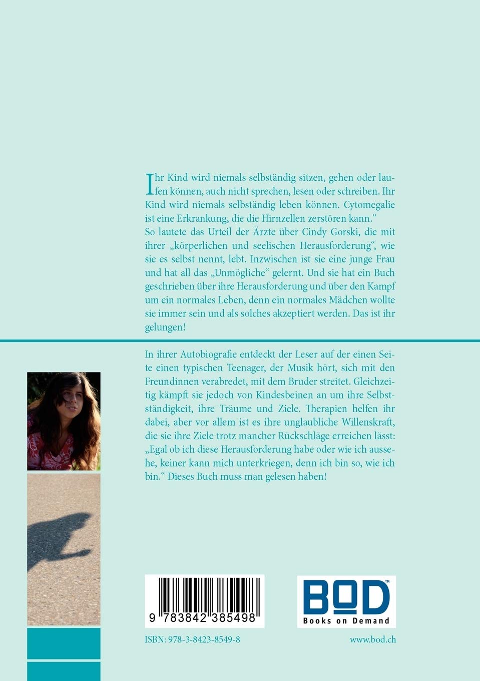 Ihr Kind wird niemals selbständig sitzen, gehen oder laufen können, auch nicht sprechen, lesen oder schreiben. Ihr Kind wird niemals selbständig leben können. Cytomegalie ist eine Erkrankung, die die Hirnzellen zerstören kann. So lautete das Urteil der Ärzte über Cindy Gorski, die mit ihrer körperlichen und seelischen Herausforderung , wie sie es selbst nennt, lebt. Inzwischen ist sie eine junge Frau und hat all das Unmögliche gelernt. Und sie hat ein Buch geschrieben über ihre Herausforderung und über den Kampf um ein normales Leben, denn ein normales Mädchen wollte sie immer sein und als solches akzeptiert werden. Das ist ihr gelungen! In ihrer Autobiografie entdeckt der Leser auf der einen Seite einen typischen Teenager, der Musik hört, sich mit den Freundinnen verabredet, mit dem Bruder streitet. Gleichzeitig kämpft sie jedoch von Kindesbeinen an um ihre Selbstständigkeit, ihre Träume und Ziele. Therapien helfen ihr dabei, aber vor allem ist es ihre unglaubliche Willenskraft, die sie ihre Ziele trotz mancher Rückschläge erreichen lässt: Egal ob ich diese Herausforderung habe oder wie ich aussehe, keiner kann mich unterkriegen, denn ich bin so, wie ich bin. Dieses Buch muss man gelesen haben!