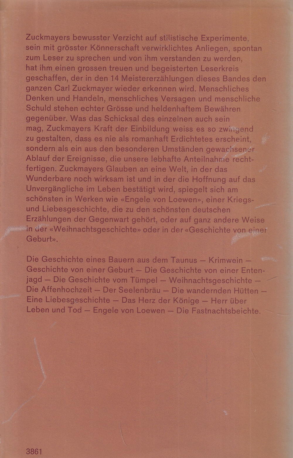 Zuckmayers bewusster Verzicht auf stilistische Experimente, sein mit grösster Könnerschaft verwirklichtes Anliegen, spontan zum Leser zu sprechen und von ihm verstanden zu werden, hat ihm einen grossen treuen und begeisterten Leserkreis geschaffen, der in den 14 Meistererzählungen dieses Bandes den ganzen Carl Zuckmayer wieder erkennen wird. Menschliches Denken und Handeln, menschliches Versagen und menschliche Schuld stehen echter Grösse und heldenhaftem Bewähren gegenüber. Was das Schicksal des einzelnen auch sein mag, Zuckmayers Kraft der Einbildung weiss es so zwingend zu gestalten, dass es nie als romanhaft Erdichtetes erscheint, sondern als ein aus den besonderen Umständen gewachsener Ablauf der Ereignisse, die unsere lebhafte Anteilnahme rechtfertigen. Zuckmayers Glauben an eine Welt, in der das Wunderbare noch wirksam ist und in der die Hoffnung auf das Unvergängliche im Leben bestätigt wird, spiegelt sich am schönsten in Werken wie «Engele von Loewen», einer Kriegsund Liebesgeschichte, die zu den schönsten deutschen Erzählungen der Gegenwart gehört, oder auf ganz andere Weise in der «Weihnachtsgeschichte» oder in der «Geschichte von einer Geburt».