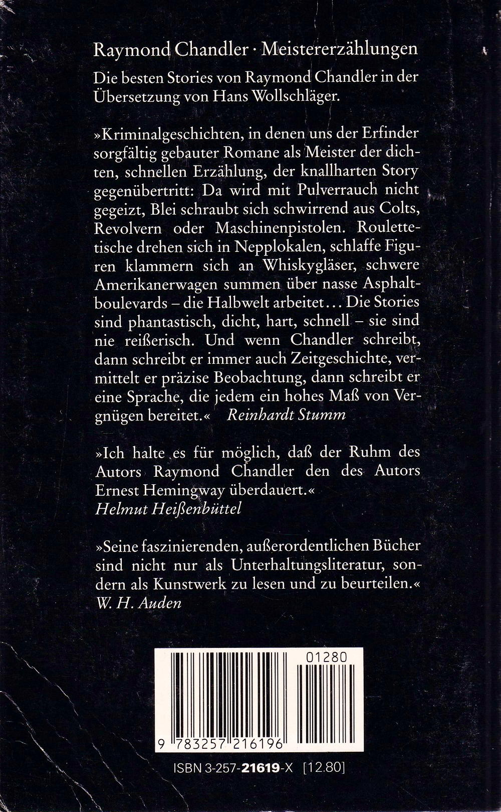 Kriminalgeschichten, in denen uns der Erfinder sorgfältig gebauter Romane als Meister der dichten, schnellen Erzählung, der knallharten Story gegenübertritt: Da wird mit Pulverrauch nicht gegeizt, Blei schraubt sich schwirrend aus Colts, Revolvern oder Maschinenpistolen. Roulettetische drehen sich in Nepplokalen, schlaffe Figuren klammern sich an Whiskygläser, schwere Amerikanerwagen summen über nasse Asphaltboulevards die Halbwelt arbeitet. Die Stories sind phantastisch, dicht, hart, schnell - sie sind nie reisserisch. Und wenn Chandler schreibt, dann schreibt er immer auch Zeitgeschichte, vermittelt er präzise Beobachtung, dann schreibt er eine Sprache, die jedem ein hohes Mass von Vergnügen bereitet. Reinhardt Stumm