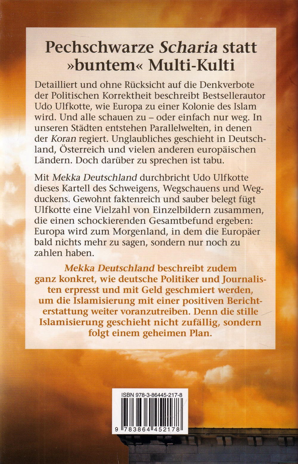 Mit Mekka Deutschland durchbricht Udo Ulfkotte dieses Kartell des Schweigens, Wegschauens und Wegduckens. Gewohnt faktenreich und sauber belegt fügt Ulfkotte eine Vielzahl von Einzelbildern zusammen, die einen schockierenden Gesamtbefund ergeben: