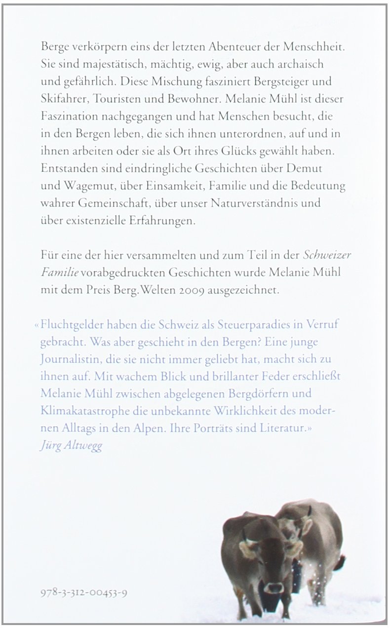 Berge verkörpern eins der letzten Abenteuer der Menschheit. Sie sind majestätisch, mächtig, ewig, aber auch archaisch und gefährlich. Diese Mischung fasziniert Bergsteiger und Skifahrer, Touristen und Einheimische, Aussteiger und Tunnelbauer gleichermassen. Die Journalistin Melanie Mühl ist dieser Faszination nachgegangen und hat Menschen besucht, die von der Aussenwelt abgeschnitten in einem Bergdorf leben, die sich den Gesetzen der Alpen unterordnen oder in der rauen Natur ihr Glück gefunden haben. Die Reportagen sind geprägt von einer einfühlsamen Neugier, von einer genauen Beobachtung und von einem brillanten Stil, der dem Leser eine wunderbare Landschaft eröffnet.