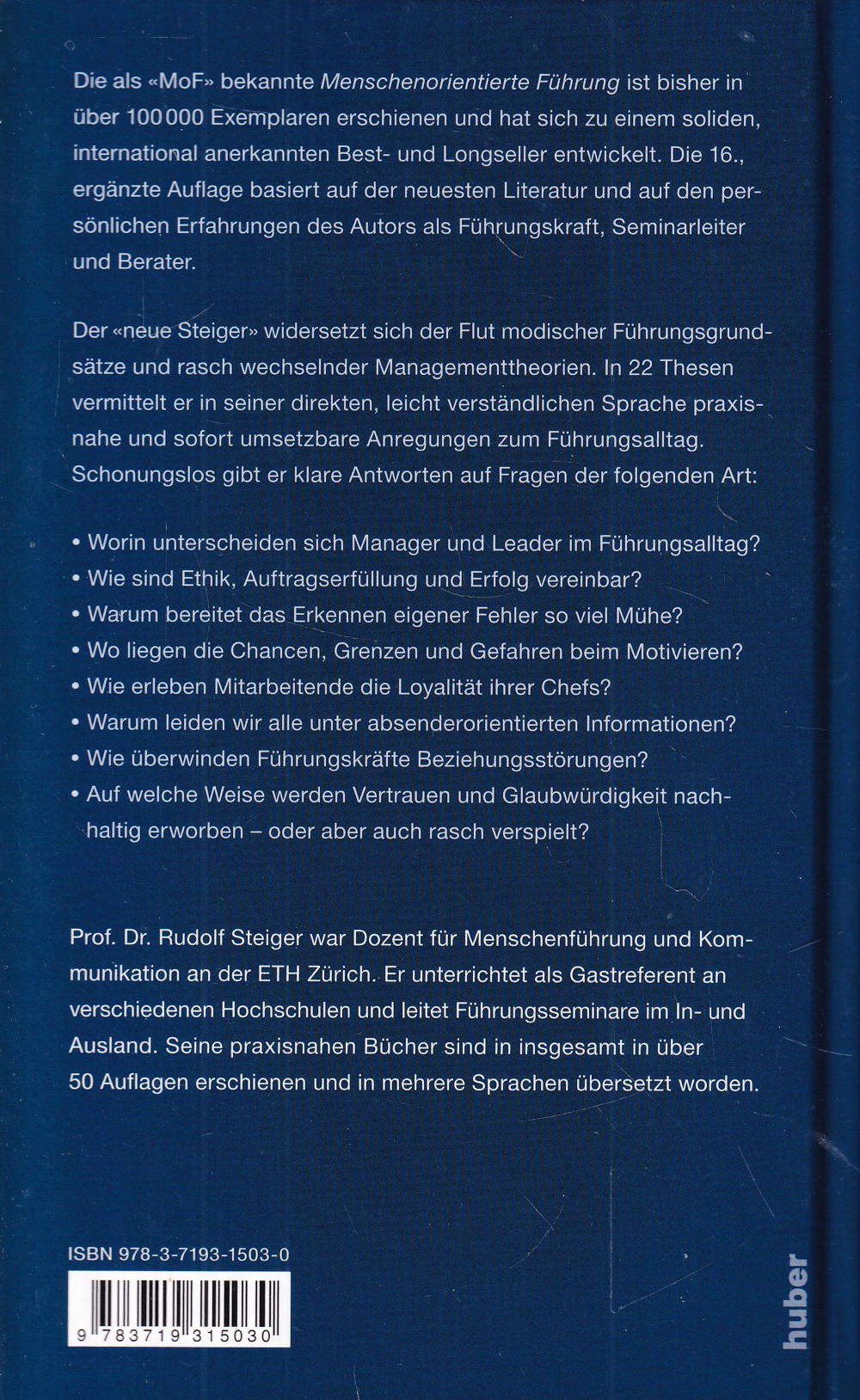 Die als «MoF» bekannte Menschenorientierte Führung ist bisher in über 100000 Exemplaren erschienen und hat sich zu einem soliden, international anerkannten Best- und Longseller entwickelt. Die 16., ergänzte Auflage basiert auf der neuesten Literatur und auf den persönlichen Erfahrungen des Autors als Führungskraft, Seminarleiter und Berater.