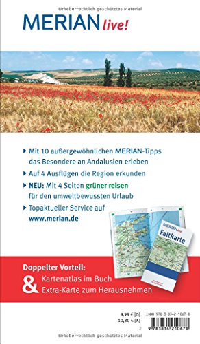 Maurenarchitektur, urwüchsige Landschaft, viel Sonne und sinnliches Lebensgefühl prägen Andalusien. Stille Gärten und weite Landschaften, sehenswerte Städte und endlose Strände - das Land zwischen Küste und Gebirge verzaubert durch seine Vielfalt. MERIAN live! bietet: - Fundierte Beschreibungen aller wichtigen Orte, Sehenswürdigkeiten und Museen - Sorgfältig ausgewählte Hotel- und Restaurantempfehlungen, Ausgeh- und Shoppingadressen sowie Tipps für Familien - Empfehlungen für den umweltbewussten Urlaub im Kapitel grüner reisen - 10 MERIAN-TopTen stellen die Höhepunkte der Region vor - 10 MERIAN-Tipps führen zu den unbekannten Seiten der Region - Stadtpläne von Sevilla, Málaga, Cádiz, Córdoba, Granada und Almería sowie eine Detailkarte der Alhambra in Granada zur leichten Orientierung - Doppelter Vorteil: Kartenatlas im Buch und Extra-Karte zum Herausnehmen.