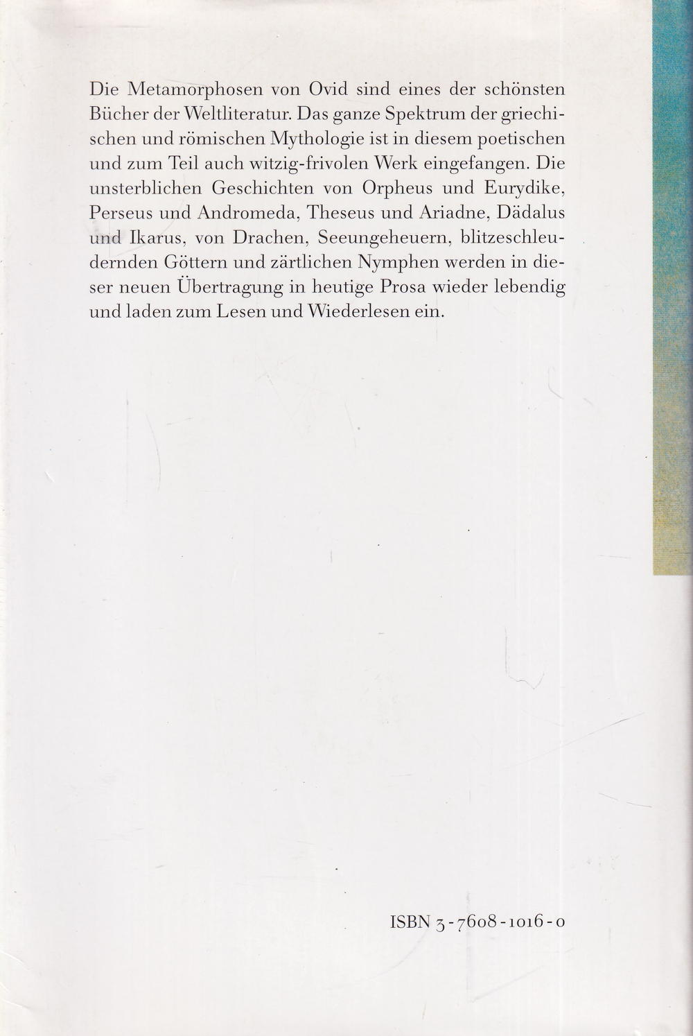 Die Metamorphosen von Ovid sind eines der schönsten Bücher der Weltliteratur. Das ganze Spektrum der griechischen und römischen Mythologie ist in diesem poetischen und zum Teil auch witzig-frivolen Werk eingefangen. Die unsterblichen Geschichten von Orpheus und Eurydike, Perseus und Andromeda, Theseus und Ariadne, Dädalus und Ikarus, von Drachen, Seeungeheuern, blitzeschleudernden Göttern und zärtlichen Nymphen werden in dieser neuen Ubertragung in heutige Prosa wieder lebendig und laden zum Lesen und WViederlesen ein.