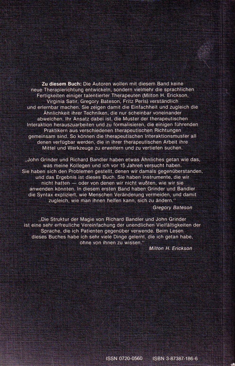 Zu diesem Buch: Die Autoren wollen mit diesem Band keine neue Therapierichtung entwickeln, sondern vielmehr die sprachlichen Fertigkeiten einiger talentierter Therapeuten (Milton H. Erickson, Virginia Satir, Gregory Bateson, Fritz Perls) verständlich und erlernbar machen. Sie zeigen damit die Einfachheit und zugleich die Ähnlichkeit ihrer Techniken, die nur scheinbar voneinander abweichen. Ihr Ansatz dabei ist, die Muster der therapeutischen Interaktion herauszuarbeiten und zu formalisieren, die einigen führenden Praktikern aus verschiedenen therapeutischen Richtungen gemeinsam sind. So können die therapeutischen Interaktionsmuster all denen verfügbar werden, die in ihrer therapeutischen Arbeit ihre Mittel und Werkzeuge zu erweitern und zu vertiefen suchen.