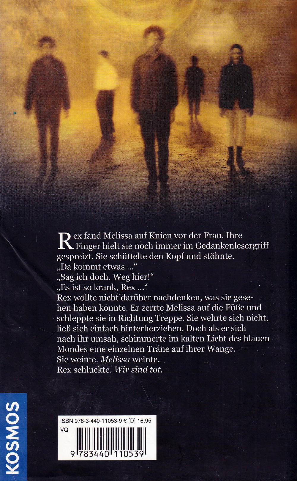 Rex fand Melissa auf Knien vor der Frau. Ihre Finger hielt sie noch immer im Gedankenlesergriff gespreizt. Sie schüttelte den Kopf und stöhnte. „Da kommt etwas …“ „Sag ich doch. Weg hier!“ „Es ist so krank, Rex …“ Rex wollte nicht darüber nachdenken, was sie gesehen haben könnte. Er zerrte Melissa auf die Füsse und schleppte sie in Richtung Treppe. Sie wehrte sich nicht, liess sich einfach hinterher ziehen. Doch als er sich nach ihr umsah, schimmerte im kalten Licht des blauen Mondes eine einzelnen Träne auf ihrer Wange. Sie weinte. Melissa weinte. Rex schluckte. Wir sind tot. .