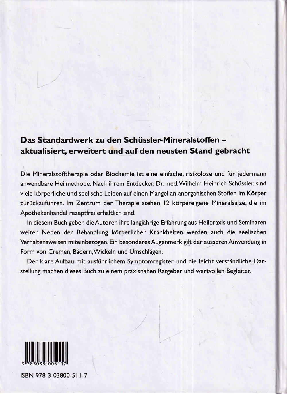 Die Mineralstofftherapie ist eine einfache, risikolose und für jedermann anwendbare Heilmethode. Nach ihrem Entdecker, Dr. med. W. H. Schüssler, sind viele körperliche und seelische Leiden auf einen Mangel an anorganischen Stoffen im Körper zurückzuführen. Im Zentrum der Therapie stehen 12 körpereigene Mineralsalze, die rezeptfrei erhältlich sind. In diesem Buch geben die Autoren unter Berücksichtigung neuster Erkenntnisse ihre langjährige Erfahrung aus Heilpraxis und Seminaren weiter. Neben der Behandlung körperlicher Krankheiten werden auch seelische Zustände und Verhaltensweisen mit einbezogen sowie Hinweise auf die Ernährung gegeben. Ein besonderes Augenmerk gilt der äusseren Anwendung in Form von Salben, Bädern, Wickeln und Umschlägen. Ergänzungsmittel werden ausführlich besprochen. Der klare Aufbau mit ausführlichem Symptomregister und die leicht verständliche Darstellung machen dieses Buch zu einem aktuellen, praxisnahen Ratgeber und wertvollen Begleiter.