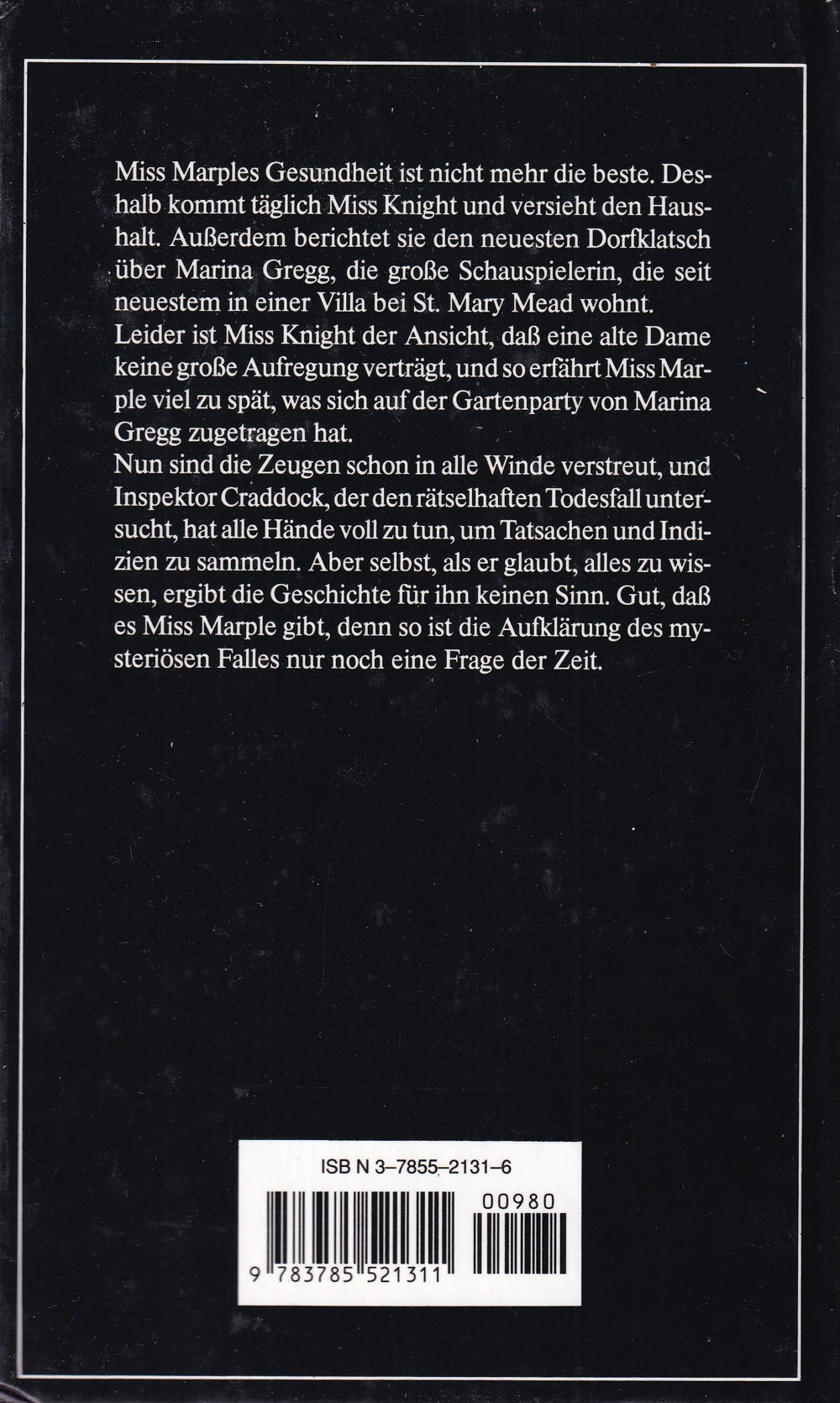 Miss Marples Gesundheit ist nicht mehr die beste. Deshalb kommt täglich Miss Knight und versieht den Haushalt. Ausserdem berichtet sie den neuesten Dorfklatsch über Marina Gregg, die grosse Schauspielerin, die seit neuestem in einer Villa bei St. Mary Mead wohnt. Leider ist Miss Knight der Ansicht, dass eine alte Dame keine grosse Aufregung verträgt, und so erfährt Miss Marple viel zu spät, was sich auf der Gartenparty von Marina Gregg zugetragen hat. Nun sind die Zeugen schon in alle Winde verstreut, und Inspektor Craddock, der den rätselhaften Todesfall untersucht, hat alle Hände voll zu tun, um Tatsachen und Indizien zu sammeln. Aber selbst, als er glaubt, alles zu wissen, ergibt die Geschichte für ihn keinen Sinn. Gut, dass es Miss Marple gibt, denn so ist die Aufklärung des mysteriösen Falles nur noch eine Frage der Zeit.