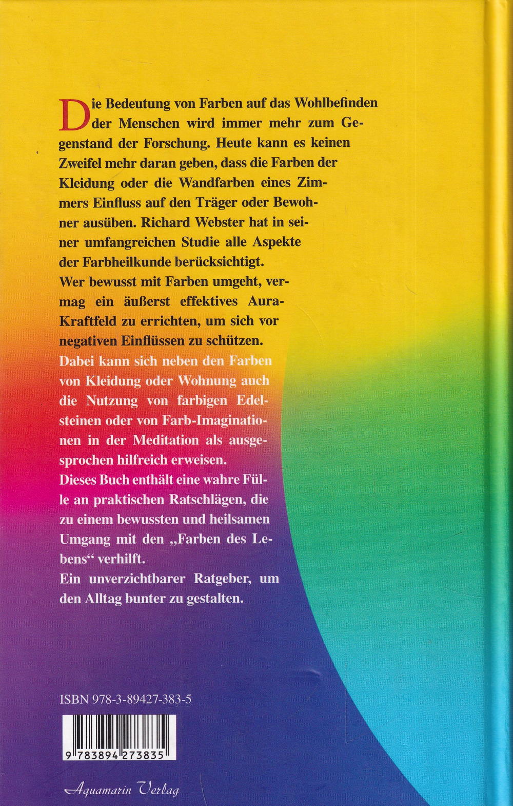 Die Bedeutung von Farben auf das Wohlbefinden der Menschen wird immer mehr zum Gegenstand der Forschung. Heute kann es keinen Zweifel mehr daran geben, dass die Farben der Kleidung oder die Wandfarben eines Zimmers Einfluss auf den Träger oder Bewohner ausüben. Richard Webster hat in seiner umfangreichen Studie alle Aspekte der Farbheilkunde berücksichtigt.