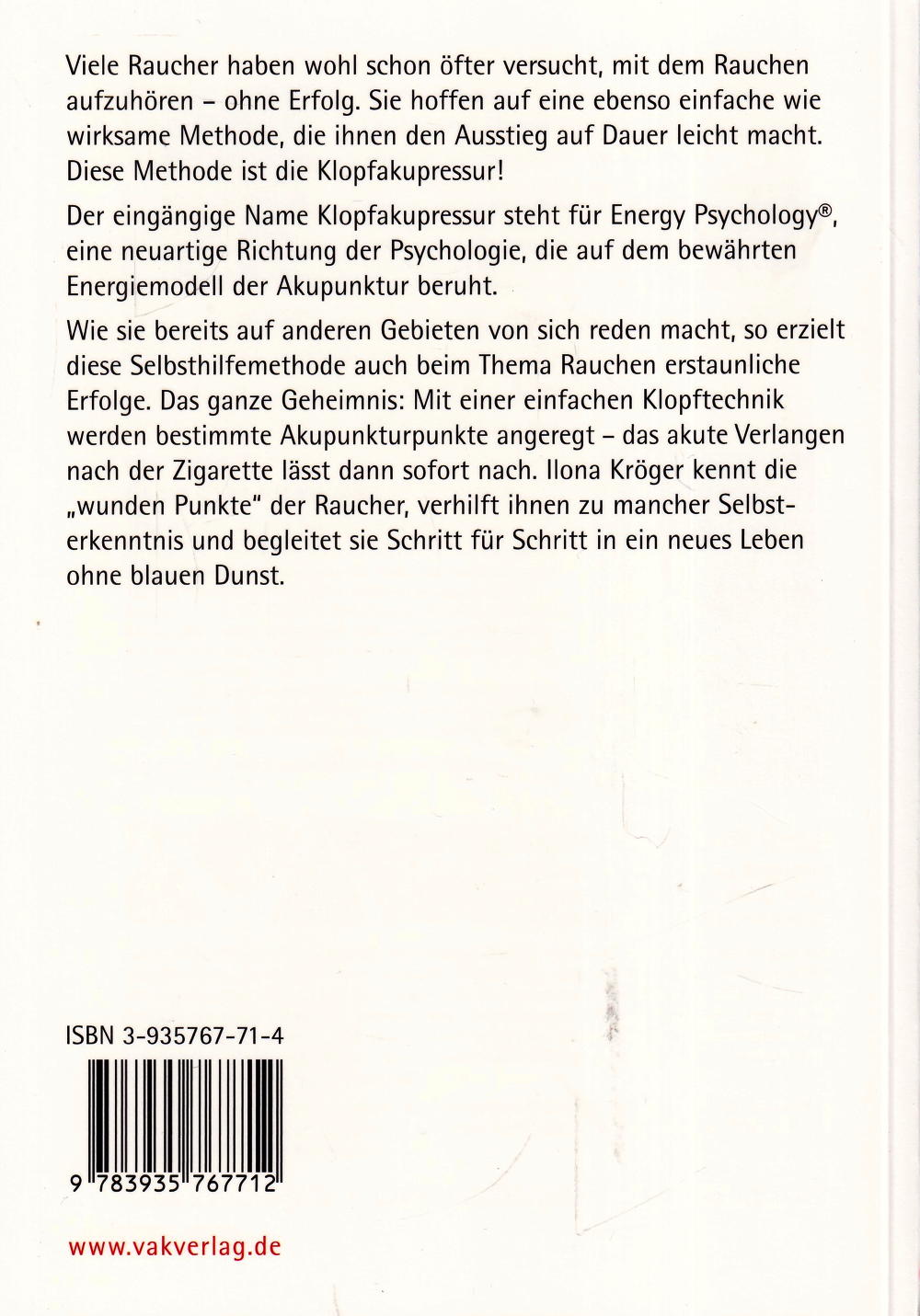 Viele Raucher wollen mit dem Rauchen aufhören, kennen aber keine ebenso einfache wie wirksame Methode, die ihnen den Ausstieg auf Dauer leicht macht. Diese Methode ist die Klopfakupressur. Wie sie auf anderen Gebieten von sich reden macht, so erzielt sie auch hier erstaunliche Erfolge. Das ganze Geheimnis: Mit einer einfachen Klopftechnik werden bestimmte Akupunkturpunkte stimuliert. Ilona Kröger kennt die wunden Punkte der Raucher und begleitet sie Schritt für Schritt in das neue Leben - ohne blauen Dunst.