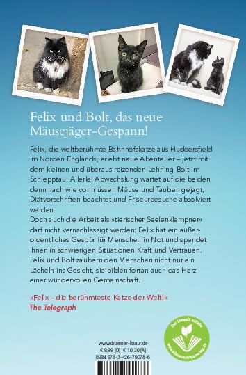 Felix erlebt neue Abenteuer - nun mit dem kleinen, süssen Kater Bolt im Schlepptau. Allerlei Abwechslung wartet auf die beiden, denn nach wie vor steht die Mäusejagd auf der Tagesordnung, neue Schlafplätze müssen eingerichtet, Diätvorschriften beachtet und Friseurbesuche absolviert werden. Sie raufen sich zusammen und bilden das Herz einer wundervollen Gemeinschaft. Felix, die Bahnhofs-Katze war 2018 ein internationaler Bestseller und auch in Deutschland mehrere Wochen auf der Bestseller-Liste. Felix ist ein weltweiter Social-Media-Hit. Die Katze hat über 130. 000 Fans bei Facebook und nutzt ihre Bekanntheit auch für karitative Zwecke, etwa Spendenaktionen für kranke Tiere.