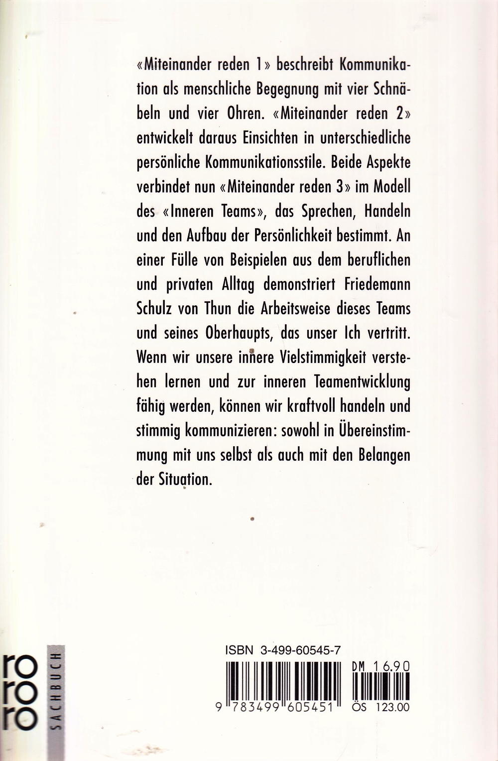 Miteinander reden 1" beschreibt Kommunikation als menschliche Begegnung mit vier Schnäbeln und vier Ohren. "Miteinander reden 2" entwickelt daraus Einsichten in unterschiedliche persönliche Kommunikationsstile. Beide Aspekte verbindet "Miteinander reden 3" im Modell des "Inneren Teams", das Sprechen, Handeln und den Aufbau der Persönlichkeit bestimmt. An einer Fülle von Beispielen aus dem beruflichen und privaten Alltag demonstriert Friedemann Schulz von Thun die Arbeitsweise dieses Teams und seines Oberhaupts, das unser Ich vertritt. Wenn wir unsere innere Vielstimmigkeit verstehen lernen und zur inneren Teamentwicklung fähig werden, können wir kraftvoll handeln und stimmig kommunizieren: sowohl in Übereinstimmung mit uns selbst als auch mit den Belangen der Situation.