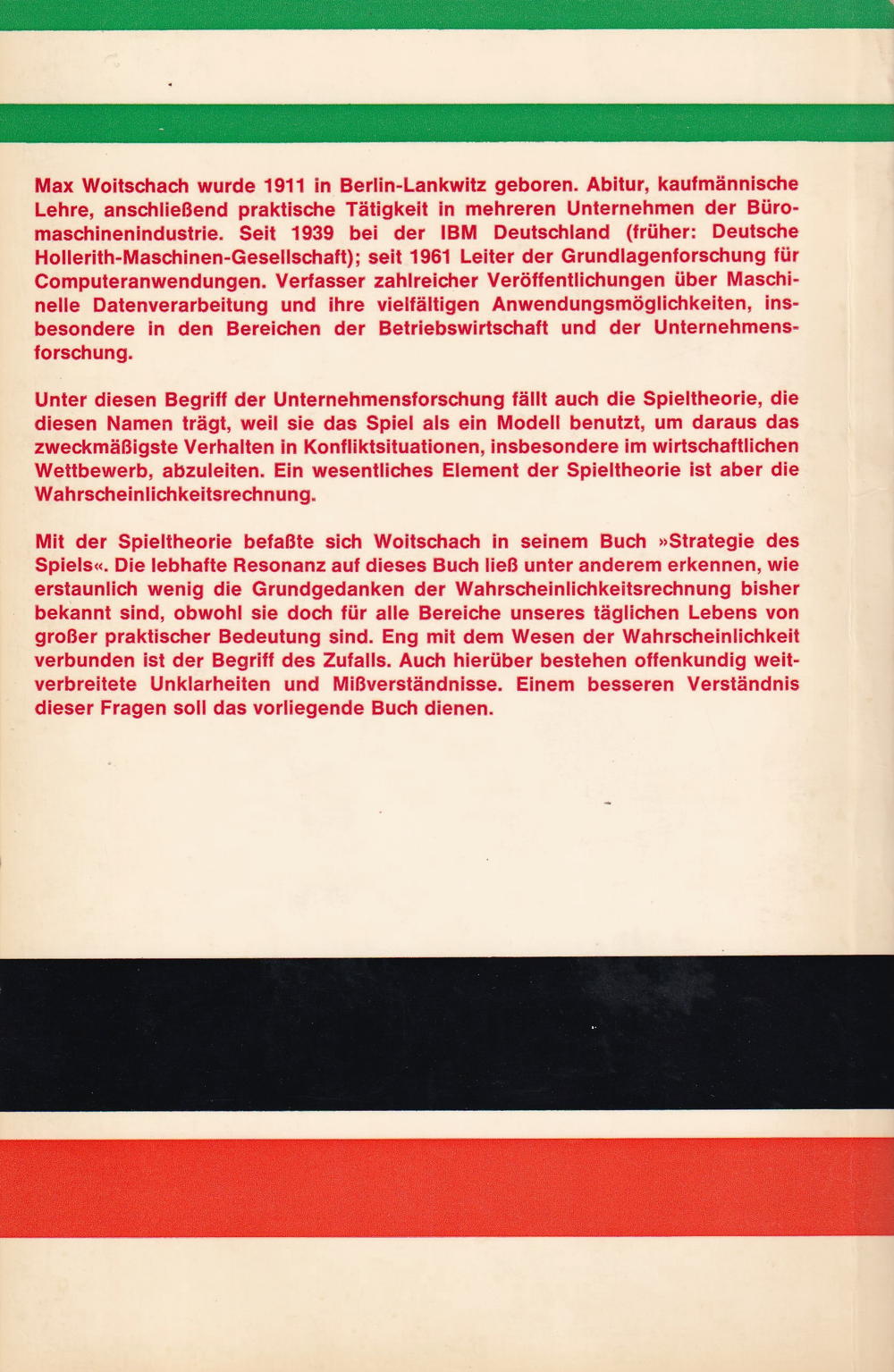 Mit der Spieltheorie befasste sich Woitschach in seinem Buch »Strategie des Spiels«. Die lebhafte Resonanz auf dieses Buch liess unter anderem erkennen, wie erstaunlich wenig die Grundgedanken der Wahrscheinlichkeitsrechnung bisher bekannt sind, obwohl sie doch für alle Bereiche unseres täglichen Lebens von grosser praktischer Bedeutung sind. Eng mit dem Wesen der Wahrscheinlichkeit verbunden ist der Begriff des Zufalls. Auch hierüber bestehen offenkundig weitverbreitete Unklarheiten und Missverständnisse. Einem besseren Verständnis dieser Fragen soll das vorliegende Buch dienen.