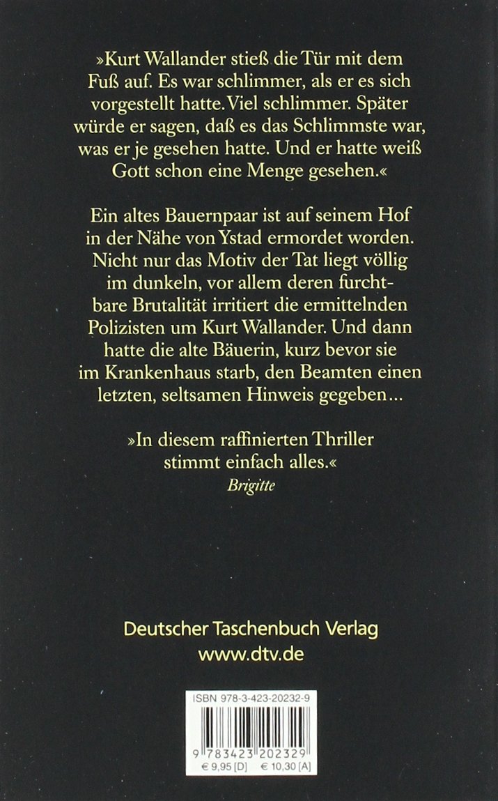 Ein altes Bauernpaar ist auf seinem Hof in der Nähe von Ystad ermordet worden. Nicht nur das Motiv der Tat liegt völlig im dunkeln, vor allen deren furchtbare Brutalität irritiert die ermittelnden Polizisten um Kurt Wallander. Und dann hatte die alte Bäuerin, kurz bevor sie im Krankenhaus starb, den Beamten einen letzten, seltsamen Hinweis gegeben...