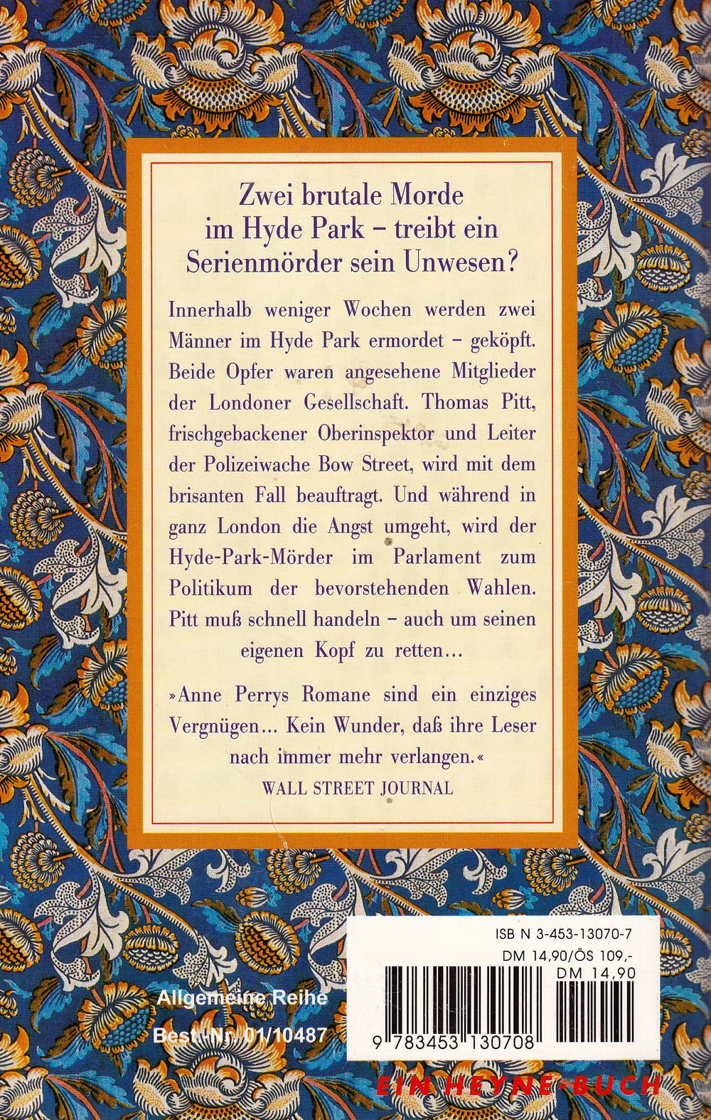 Innerhalb weniger Wochen werden zwei Männer im Hyde Park ermordet - geköpft. Beide Opfer waren angesehene Mitglieder der Londoner Gesellschaft. Thomas Pitt, frischgebackener Oberinspektor und Leiter der Polizeiwache Bow Street, wird mit dem brisanten Fall beauftragt. Und während in ganz London die Angst umgeht, wird der Hyde-Park-Mörder im Parlament zum Politikum der bevorstehenden Wahlen. Pitt muss schnell handeln - auch um seinen eigenen Kopf zu retten ...
