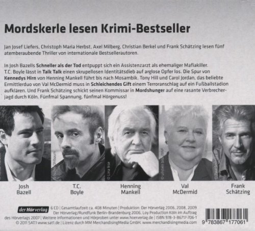 Christoph Maria Herbst liest "Schneller als der Tod" von Josh Bazell / Jan Josef Liefers liest "Talk, Talk" von T.C. Boyle / Axel Milberg liest "Kennedy`s Hirn" von Henning Mankell / Christian Berkel liest "Schleichendes Gift" von Val McDermid / Frank Schätzing liest "Mordshunger"