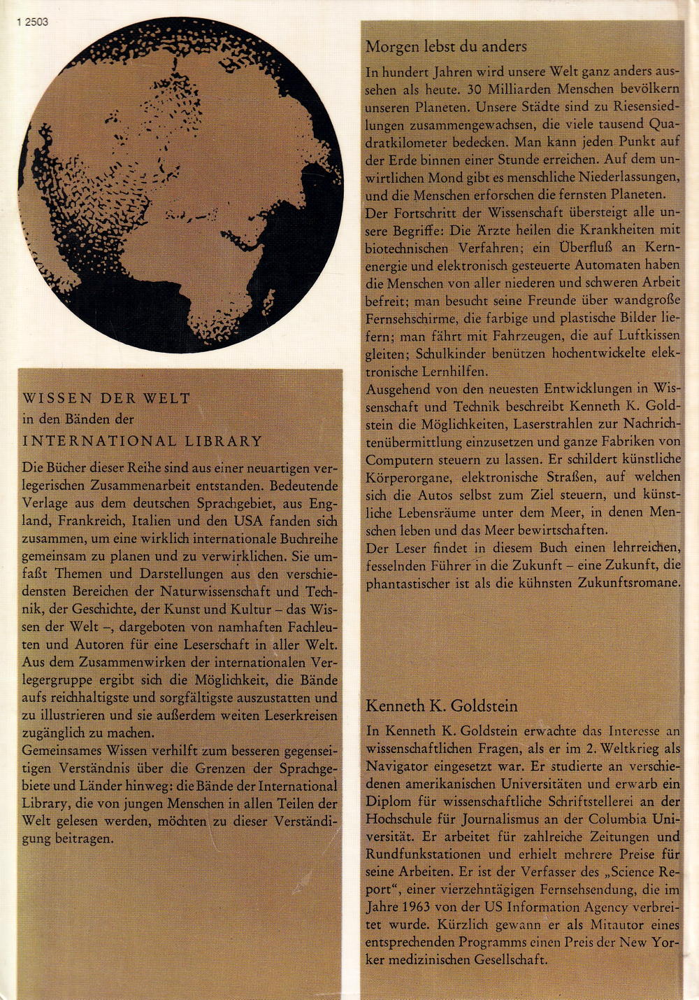 Ausgehend von den neuesten Entwicklungen in Wissenschaft und Technik beschreibt Kenneth K. Goldstein die Möglichkeiten, Laserstrahlen zur Nachrichtenübermittlung einzusetzen und ganze Fabriken von Computern steuern zu lassen. Er schildert künstliche Körperorgane, elektronische Strassen, auf welchen sich die Autos selbst zum Ziel steuern, und künstliche Lebensräume unter dem Meer, in denen Menschen leben und das Meer bewirtschaften.