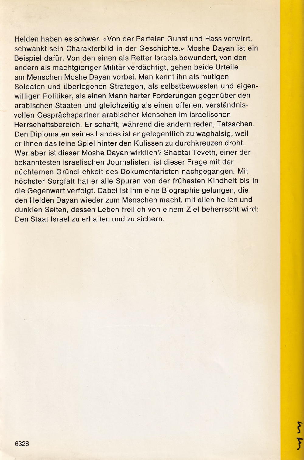 Den Diplomaten seines Landes ist er gelegentlich zu waghalsig, weil er ihnen das feine Spiel hinter den Kulissen zu durchkreuzen droht. Wer aber ist dieser Moshe Dayan wirklich? Shabtai Teveth, einer der bekanntesten israelischen Journalisten, ist dieser Frage mit der nüchternen Gründlichkeit des Dokumentaristen nachgegangen. Mit höchster Sorgfalt hat er alle Spuren von der frühesten Kindheit bis in die Gegenwart verfolgt. Dabei ist ihm eine Biographie gelungen, die den Helden Dayan wieder zum Menschen macht, mit allen hellen und dunklen Seiten, dessen Leben freilich von einem Ziel beherrscht wird: Den Staat Israel zu erhalten und zu sichern.
