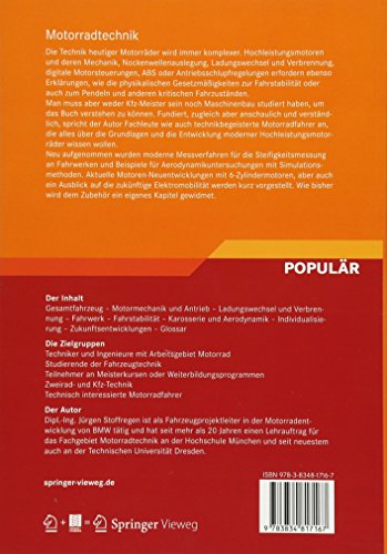 Die Technik heutiger Motorräder wird immer komplexer. Massenausgleich, digitale Motorsteuerungen, Katalysator, ABS oder Antriebsschlupfregelungen erfordern ebenso Erklärungen, wie die physikalischen Gesetzmässigkeiten, die im Fahrwerksbereich zum Pendeln oder Kick-back führen. Man muss aber weder Kfz-Meister sein noch Maschinenbau studiert haben, um das Buch verstehen zu können. Fundiert, trotzdem leicht verständlich, spricht der Autor Fachleute wie auch technikbegeisterte Motorradfahrer an, die mehr wissen wollen, als die Bedienungsanleitung hergibt oder in Motorradzeitschriften erklärt wird. Ein Abschnitt über Bordnetze und Elektronik wurde aufgenommen und neueste Entwicklungen bei Fahrwerksregelungssystemen integriert. Die Ergänzungen zu Technischem Zubehör für Umbauten zur Technikverbesserung und Optimierung der eigenen Maschine sowie noch mehr und aktualisiertes Bildmaterial runden die Neuerungen ab.