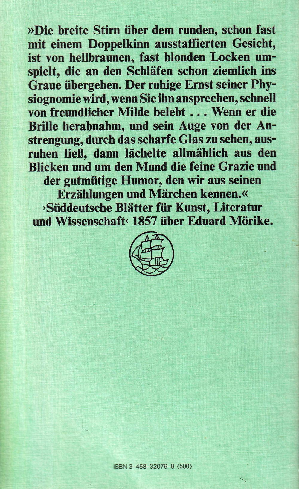 »Die breite Stirn über dem runden, schon fast mit einem Doppelkinn ausstaffierten Gesicht, ist von hellbraunen, fast blonden Locken umspielt, die an den Schläfen schon ziemlich ins Graue übergehen. Der ruhige Ernst seiner Physiognomie wird, wenn Sie ihn ansprechen, schnell von freundlicher Milde belebt... Wenn er die Brille herabnahm, und sein Auge von der Anstrengung, durch das scharfe Glas zu sehen, ausruhen liess, dann lächelte allmählich aus den Blicken und um den Mund die feine Grazie und der gutmütige Humor, den wir aus seinen Erzählungen und Märchen kennen. «