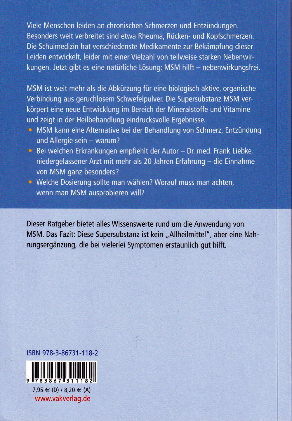 Die Super-Substanz MSM ist weit mehr als eine Abkürzung (und zwar für eine biologisch aktive, organische Verbindung aus geruchlosem Schwefelpulver). MSM gehört in den Bereich der Mineralstoffe und Vitamine und zeigt in der Heilbehandlung eindrucksvolle Ergebnisse. MSM kann eine Alternative bei der Behandlung von Schmerz, Entzündung und Allergie sein - warum? Bei welchen Erkrankungen empfiehlt der Autor (jahrelang erfahren als niedergelassener Arzt) besonders die Einnahme von MSM? Welche Dosierung sollte man wählen? Worauf muss man achten, wenn man es mit MSM probieren will?