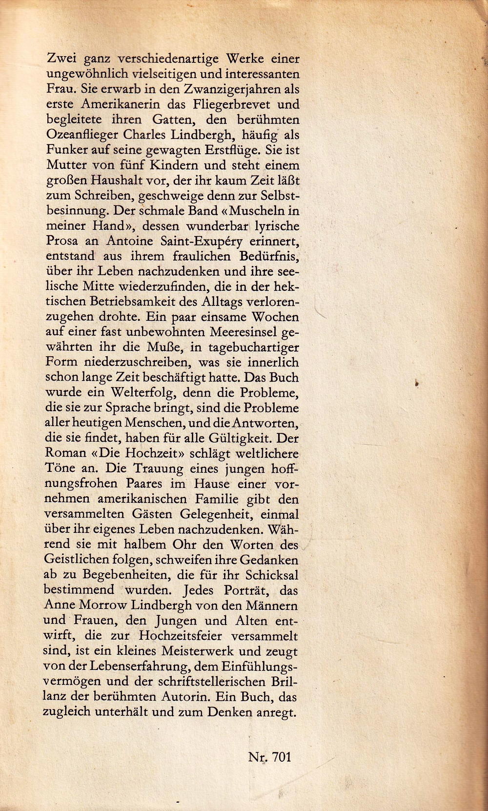 Ganz verschiedenartige Werke einer ungewöhnlich vielseitigen und interessanten Frau. Sie erwarb in den Zwanzigerjahren als erste Amerikanerin das Fliegerbrevet und begleitete ihren Gatten, den berühmten Ozeanflieger Charles Lindbergh, häufig als Funker auf seine gewagten Erstflüge. Sie ist Mutter von fünf Kindern und steht einem Zwei grossen Haushalt zum Schreiben, geschweige denn zur Selbstbesinnung. Der schmale Band «Muscheln in meiner Hand», dessen wunderbar lyrische Prosa an Antoine Saint-Exupéry erinnert, entstand aus ihrem fraulichen Bedürfnis,